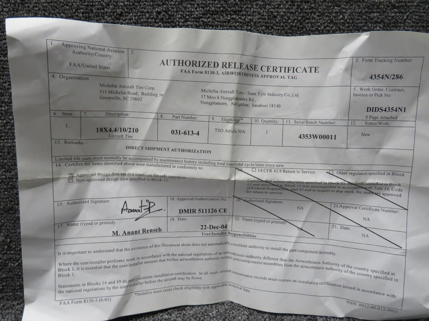 - Inspected by Michelin Aircraft Tire Corp., New, 12/22/2004