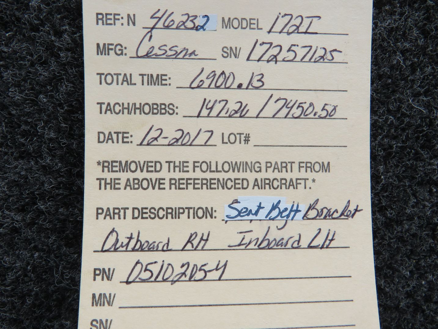 0510205-4 Cessna 172I Seat Belt Bracket Outboard RH Inboard LH
