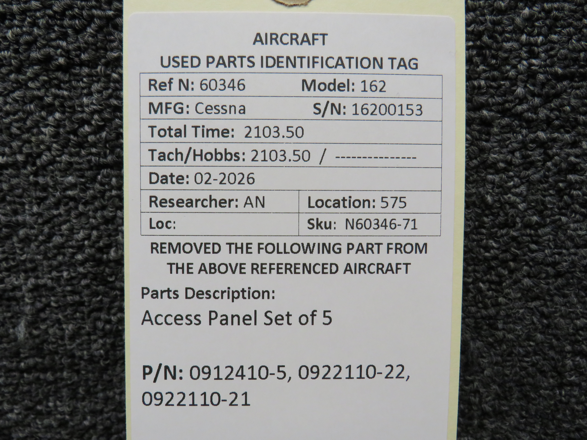 - Fuselage Panel Part Number: 0912410-5