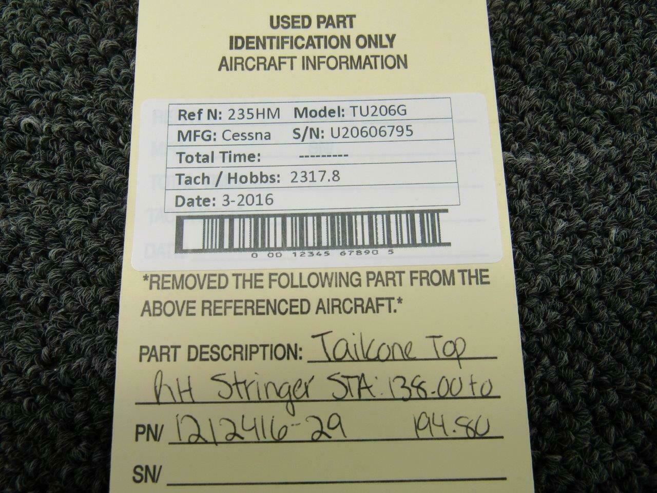 1212416-29 Cessna TU206G Tailcone Top RH Stringer STA: 138.00 to 194.80