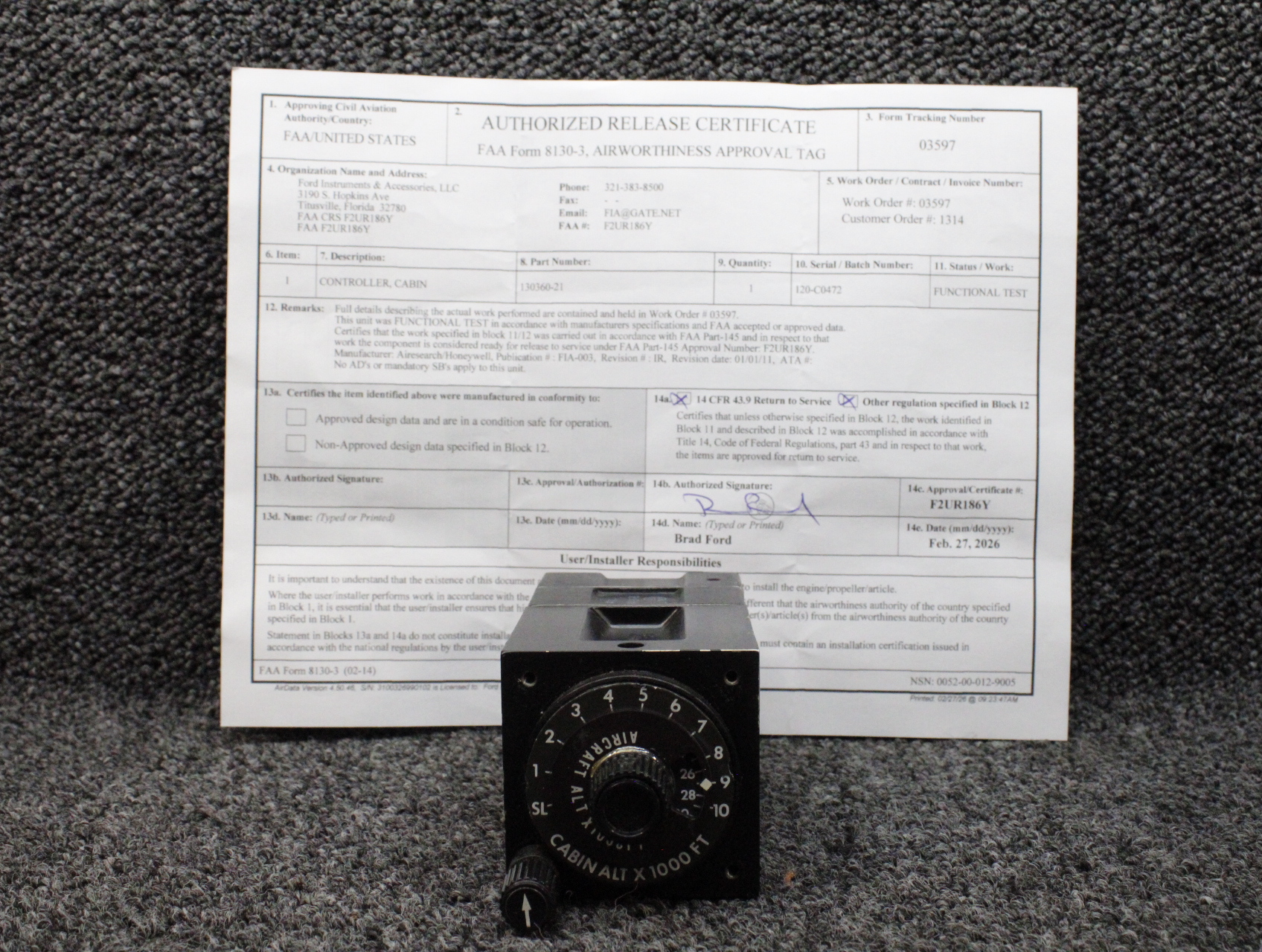 - Functional Test and Inspected by Ford Instruments February 2026