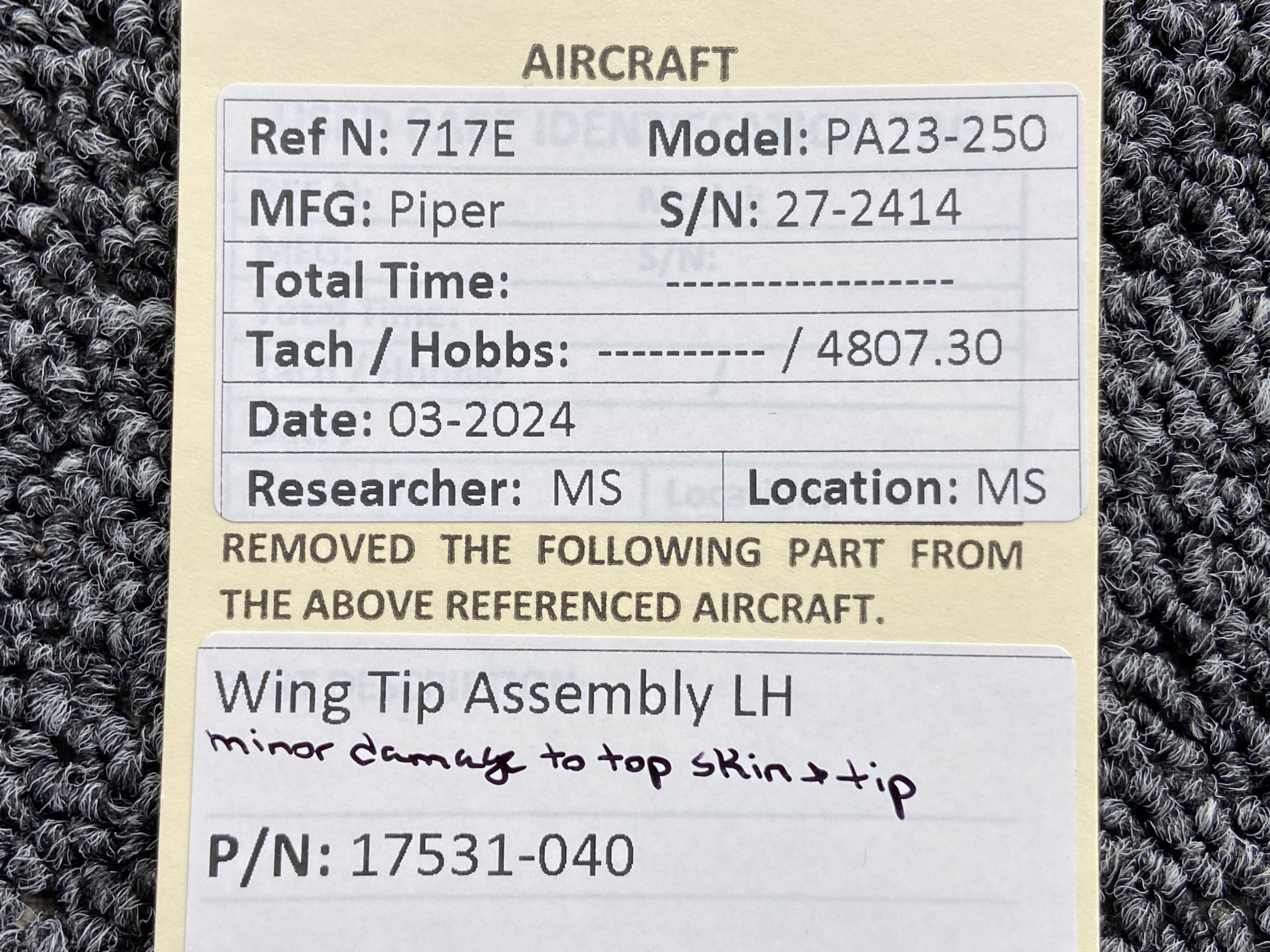 - Minor damage to top skin, see pictures for more detail