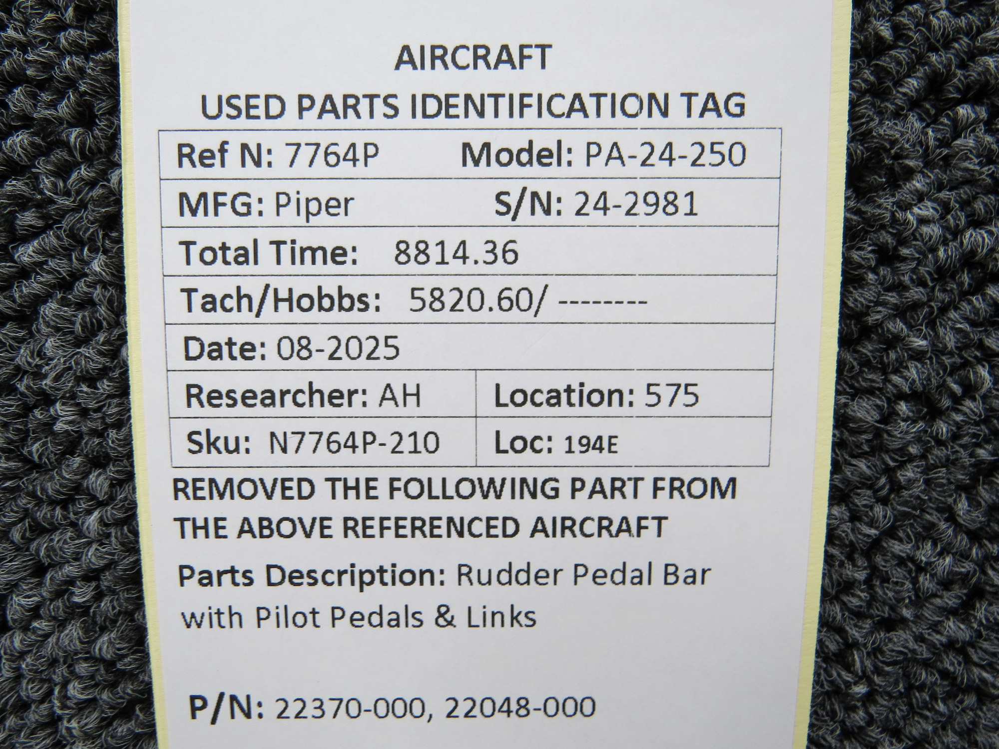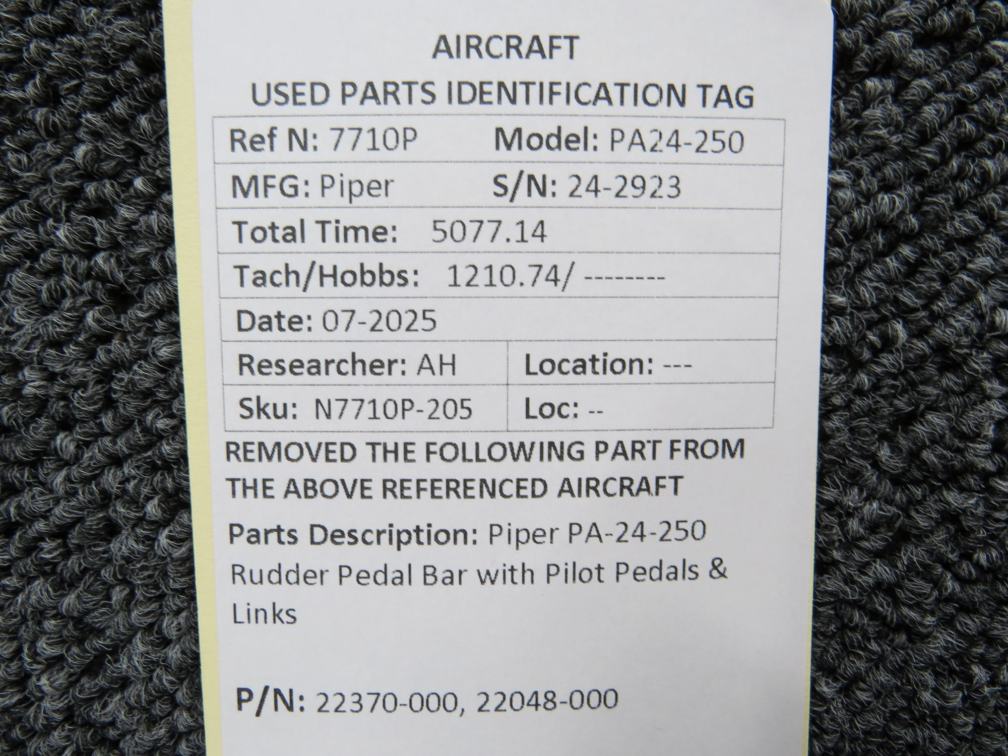 - Rudder Pedal Bar Part Number: 22370-000