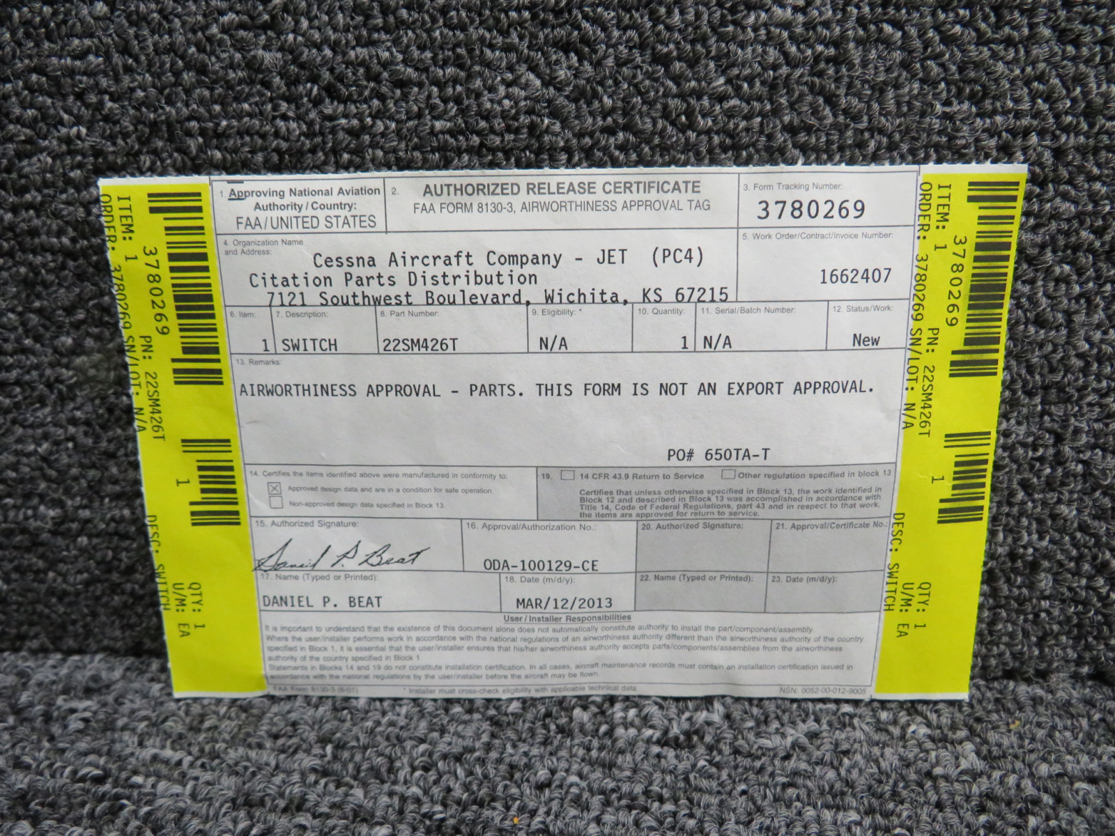- Comes with 8130-3 - 03/12/2013