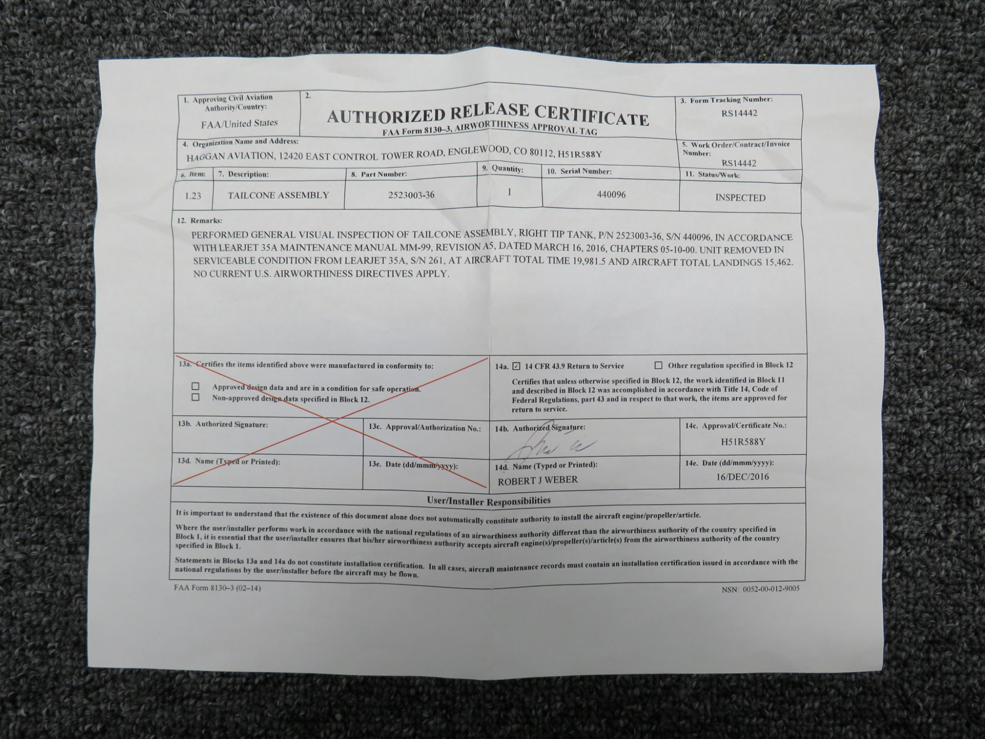 - Has 8130-3 from 12-16-2016
