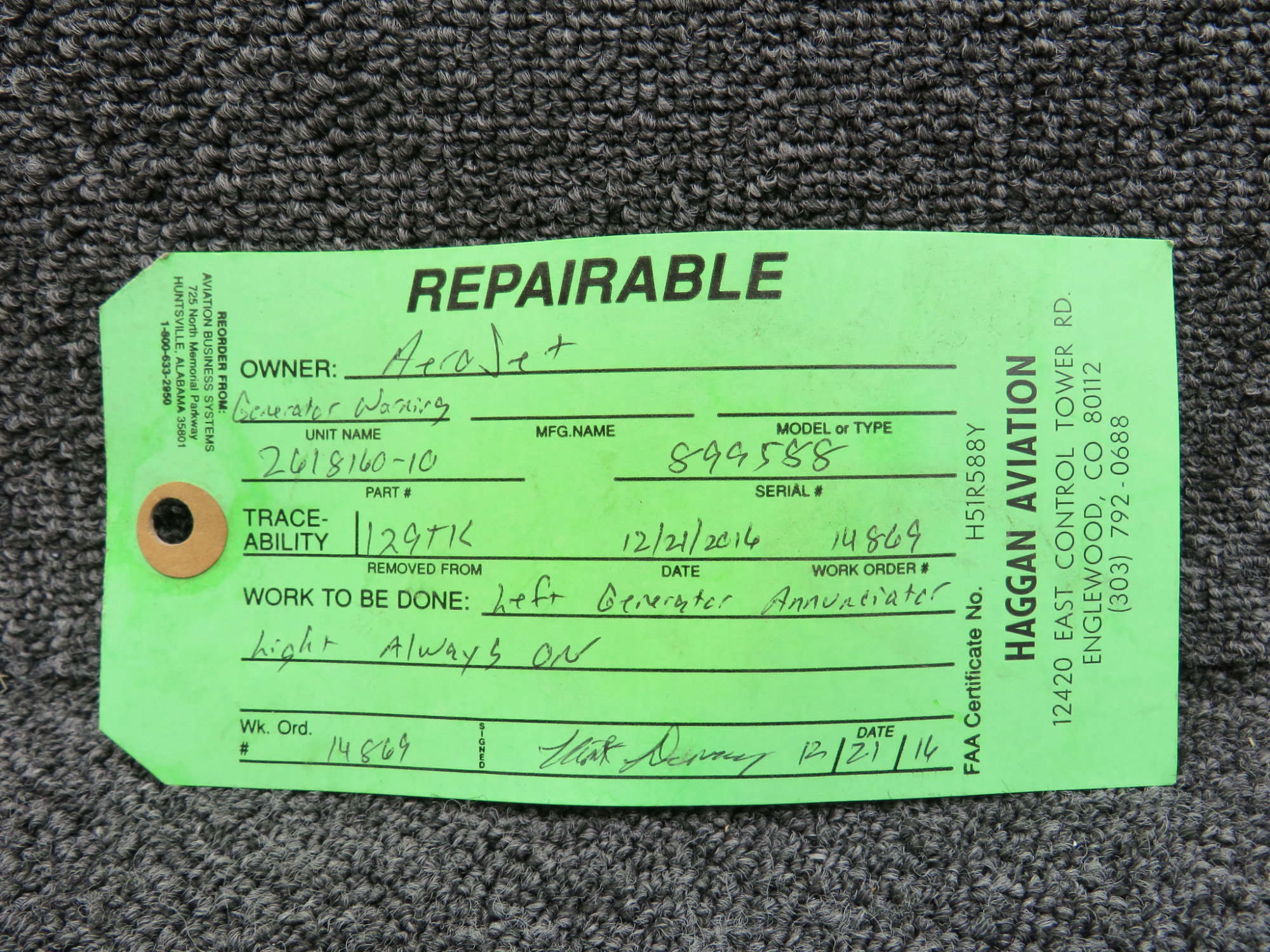 - Work to be Done: Left Generator Annunciator light always on