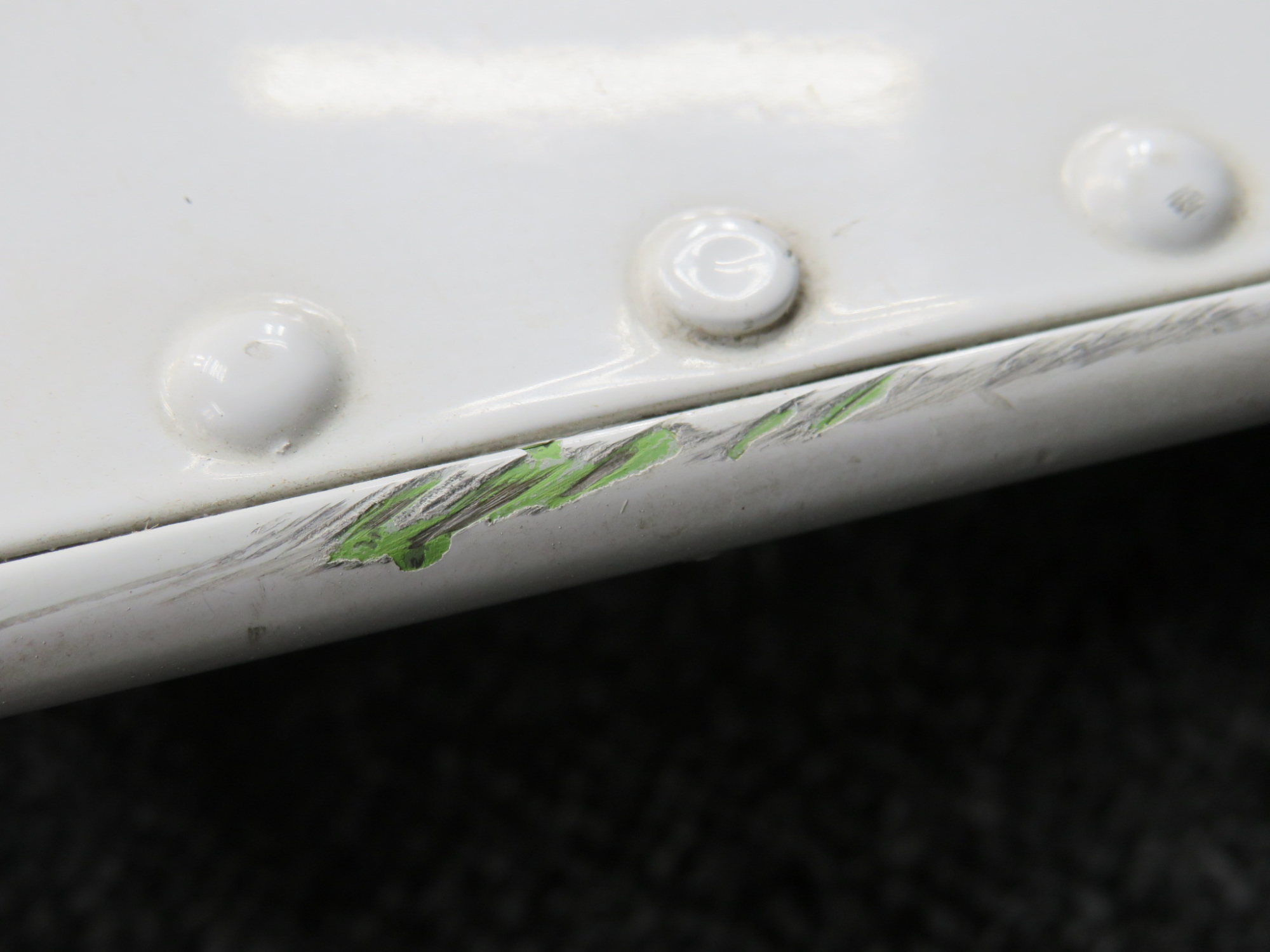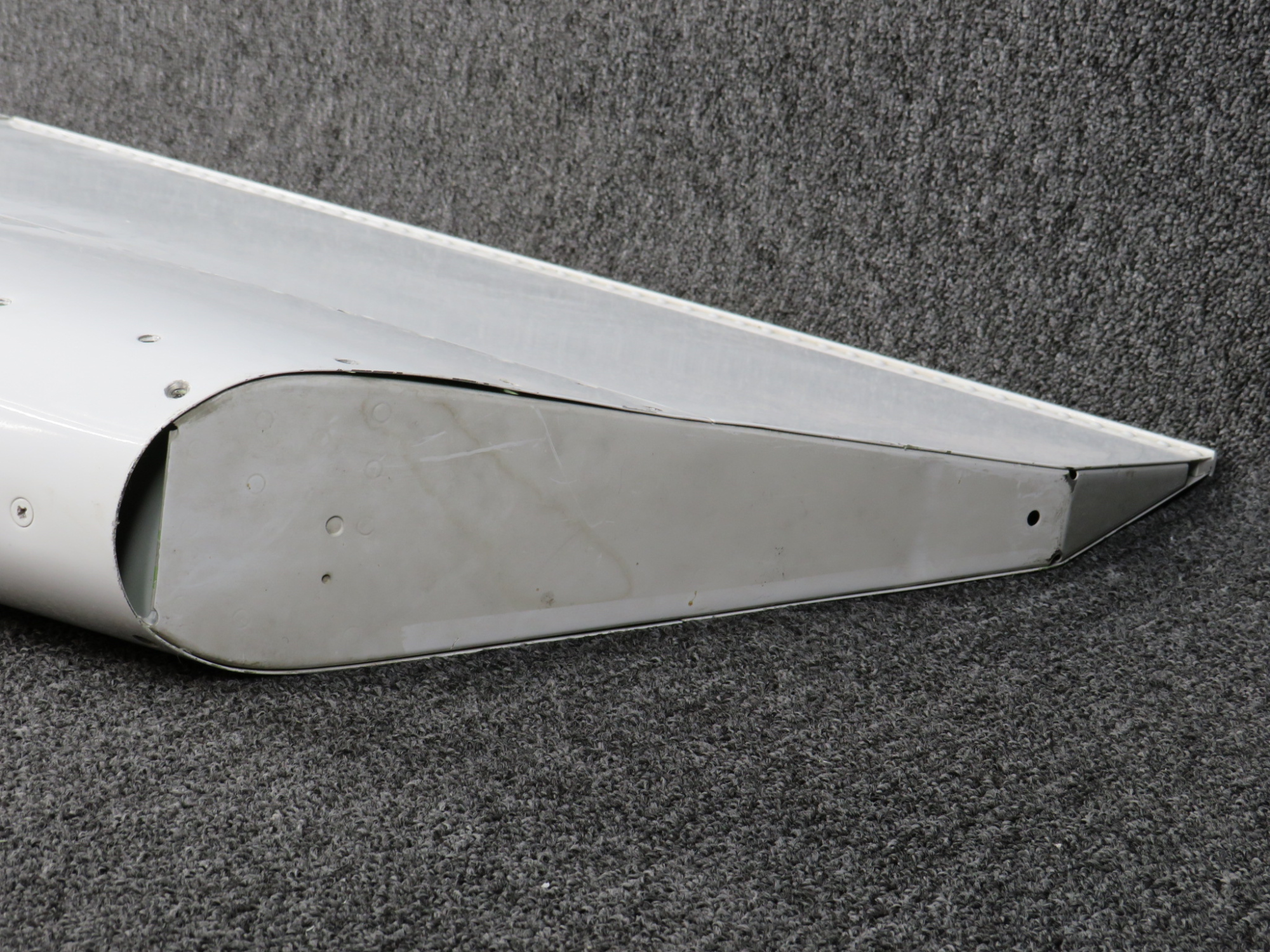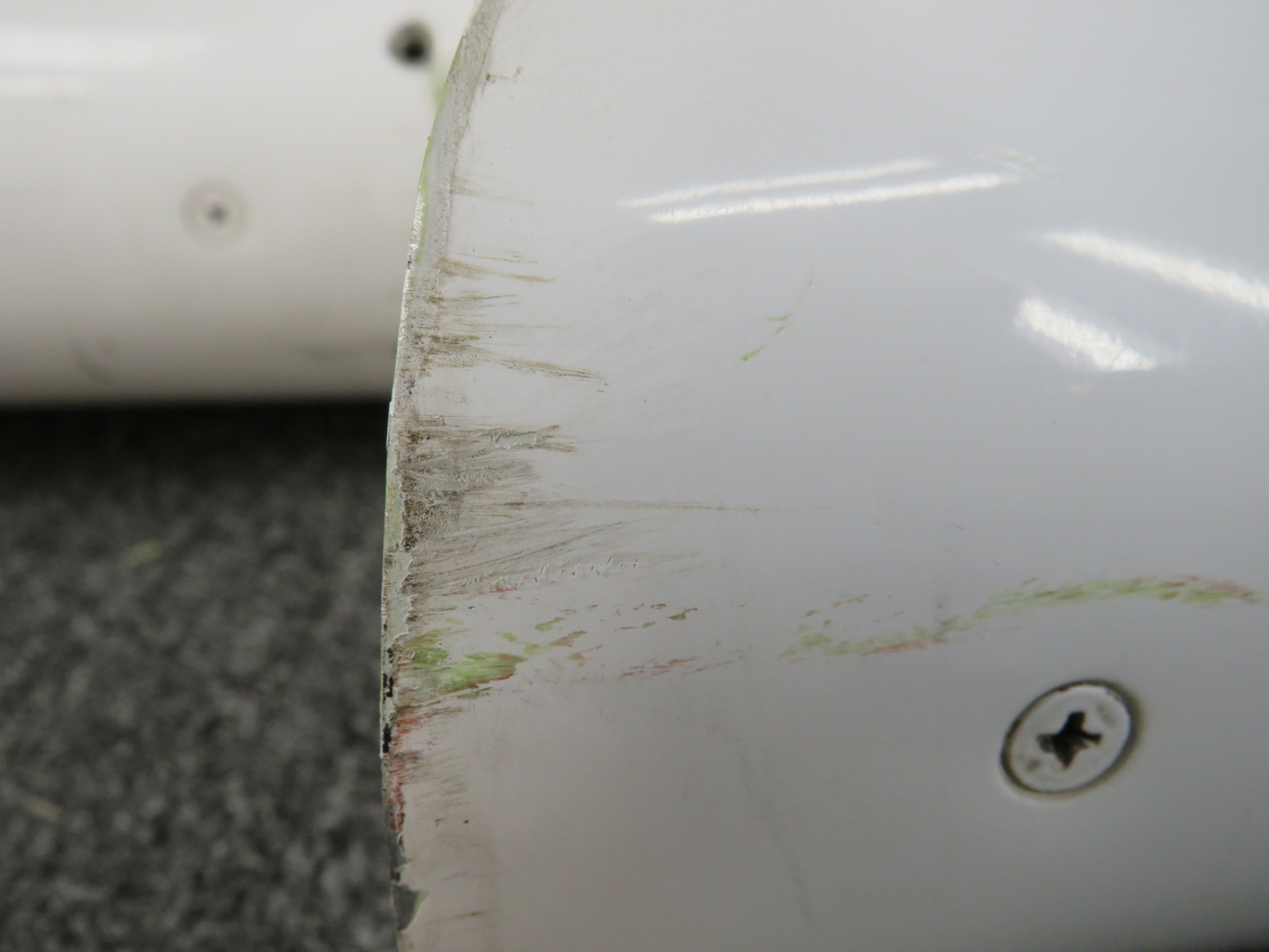 - Small dent on inner edge. Small gash on trim tab.