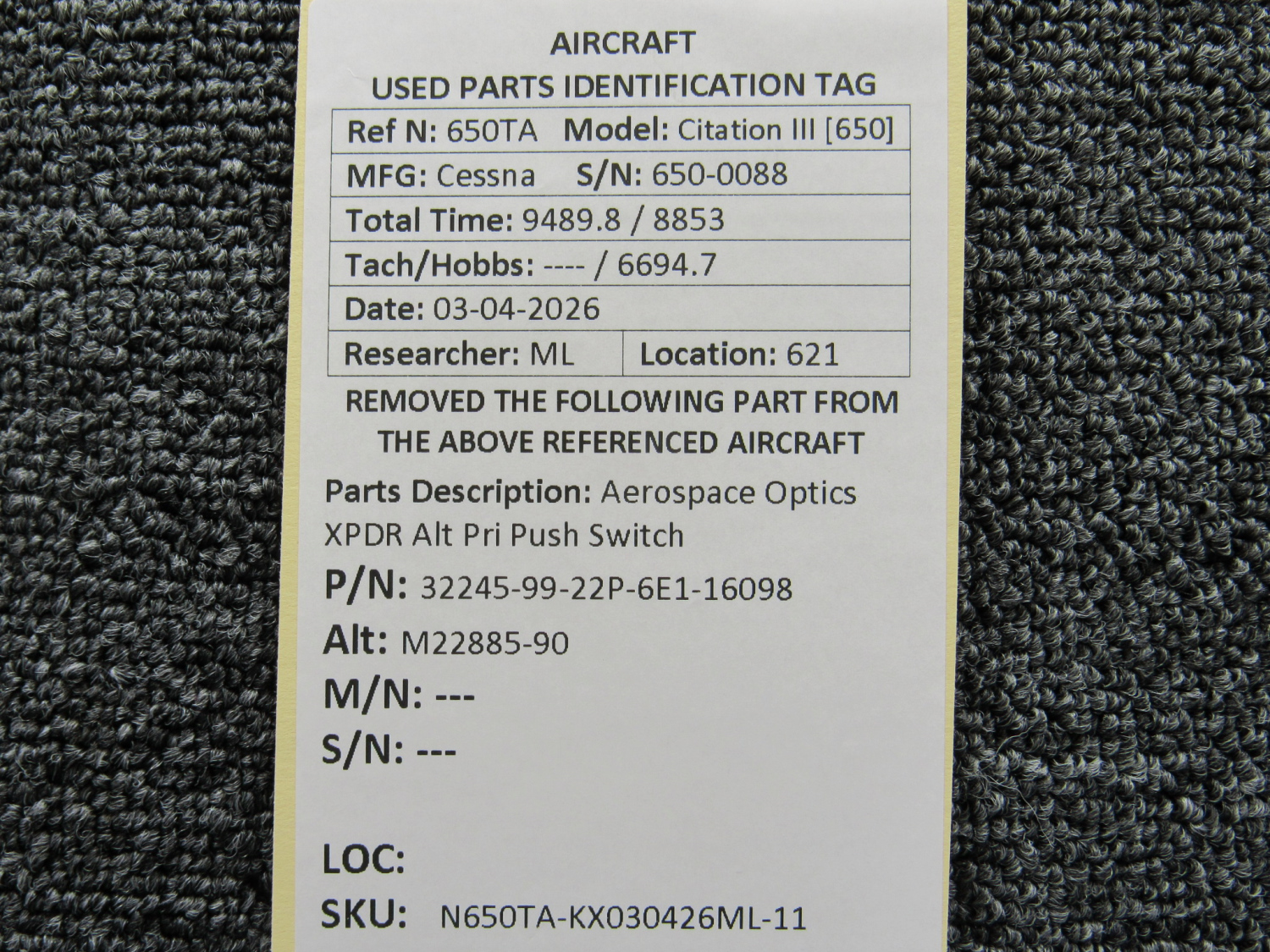 Every part is carefully inspected throughout our process and several times before it goes online. Most items are sold as-removed, just as they came off the aircraft. These parts are not functionally tested. What we do provide is clear photos, full traceability when available, pricing that reflects the as-removed condition, and a no-nonsense 90-day return window.
