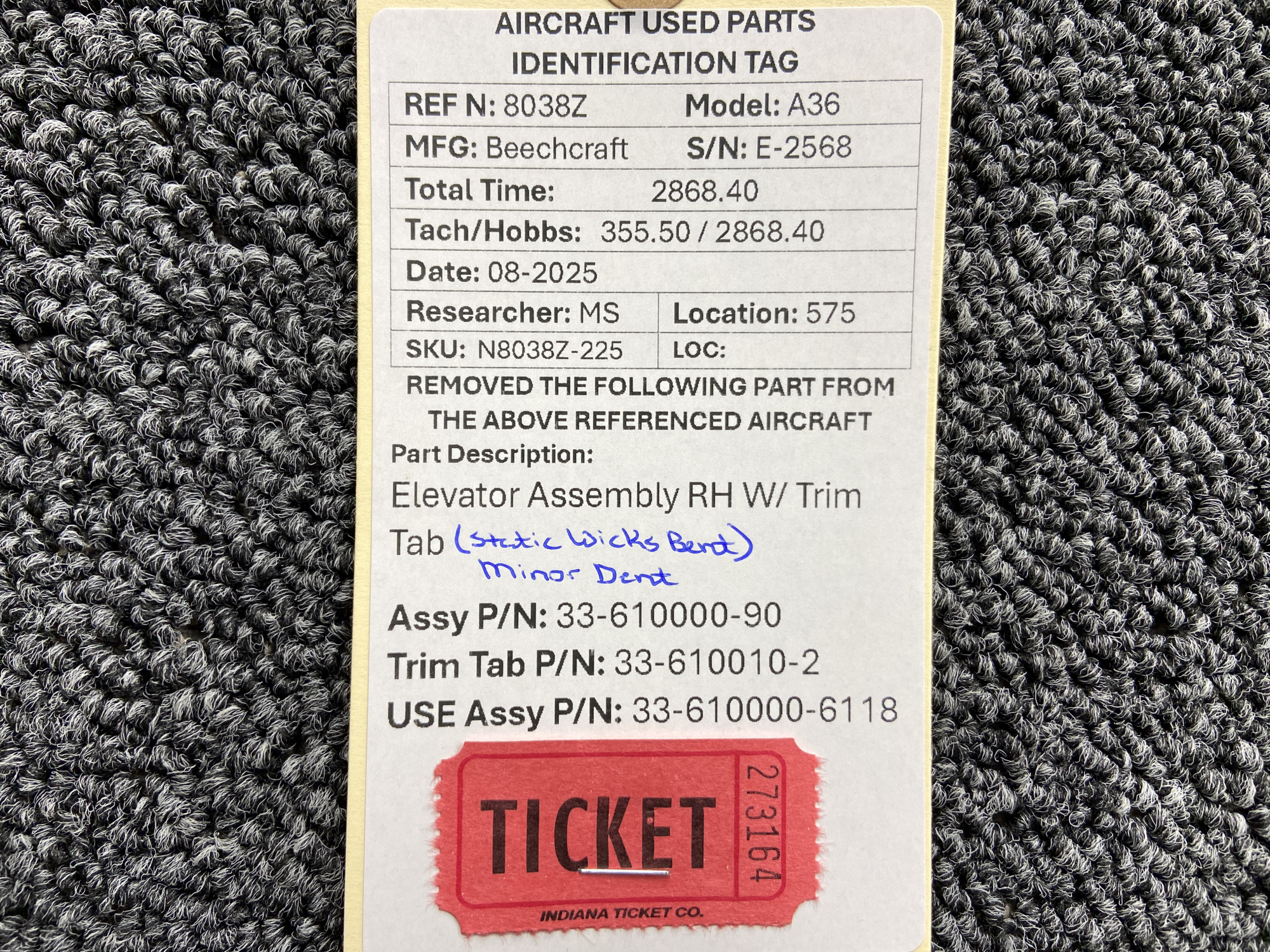 - Has one minor dent to top skin and static wicks are bent