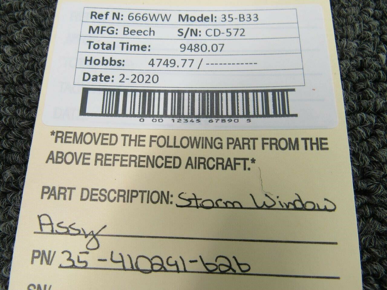 35-410291-626 Beech 35-B33 Storm Window Assy (NO Frame)