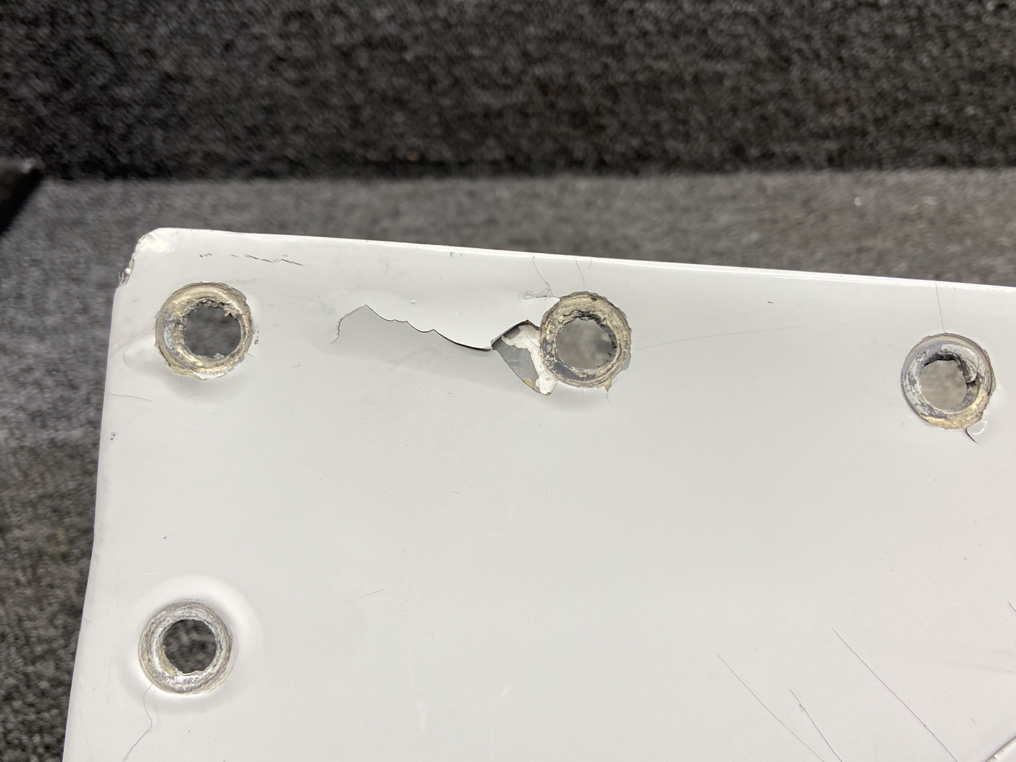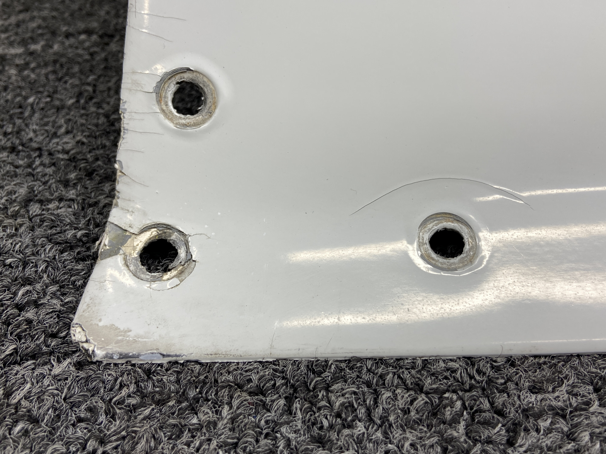 - There is damage to the mounting holes as well as cracking in the paint