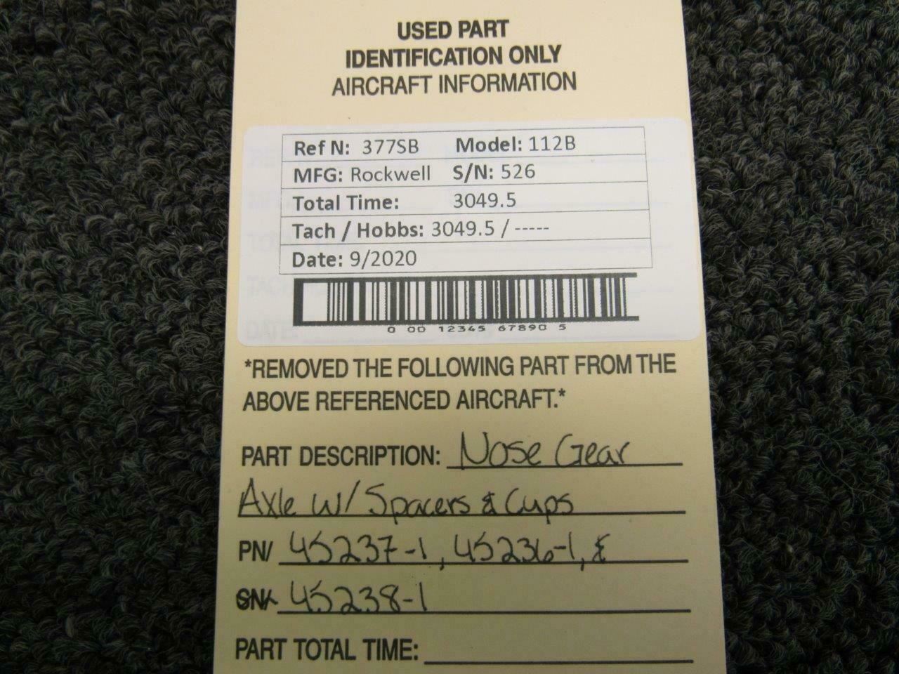 45237-1 / 45236-1 / 45238-1 Rockwell 112B Nose Gear Axle w/ Spacers & Cups