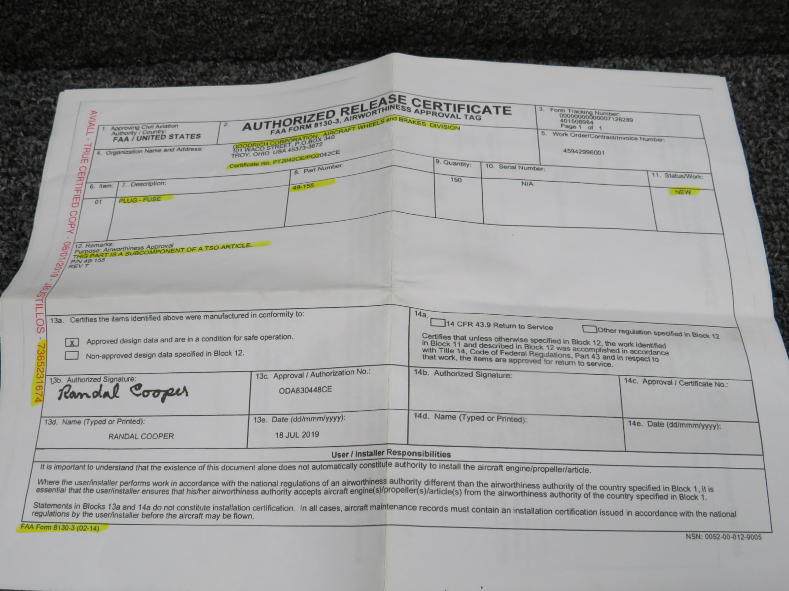 - Comes with 8130-3 - 07/18/2019