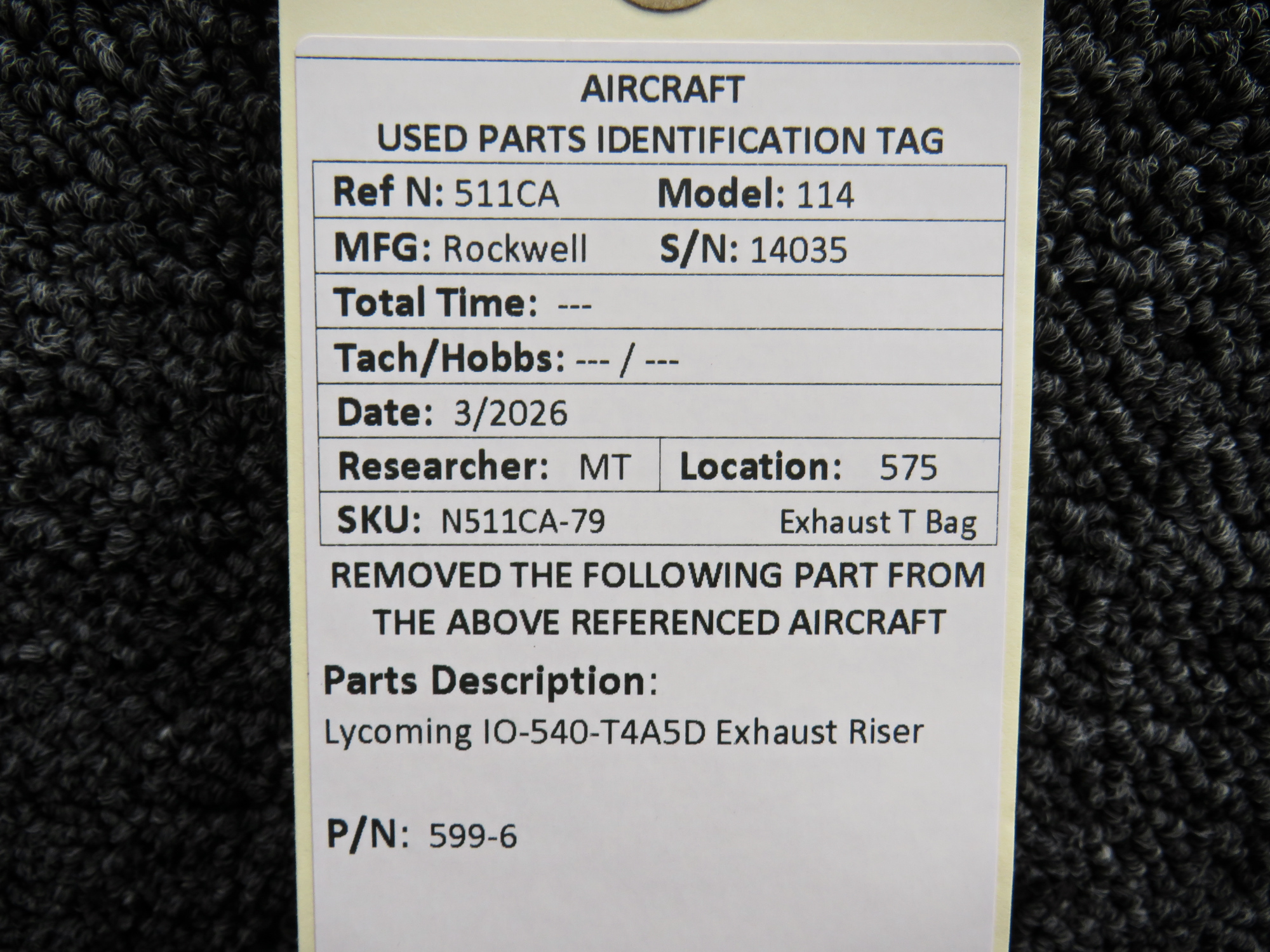- Removed From Engine: Lycoming IO-540-T4A5D