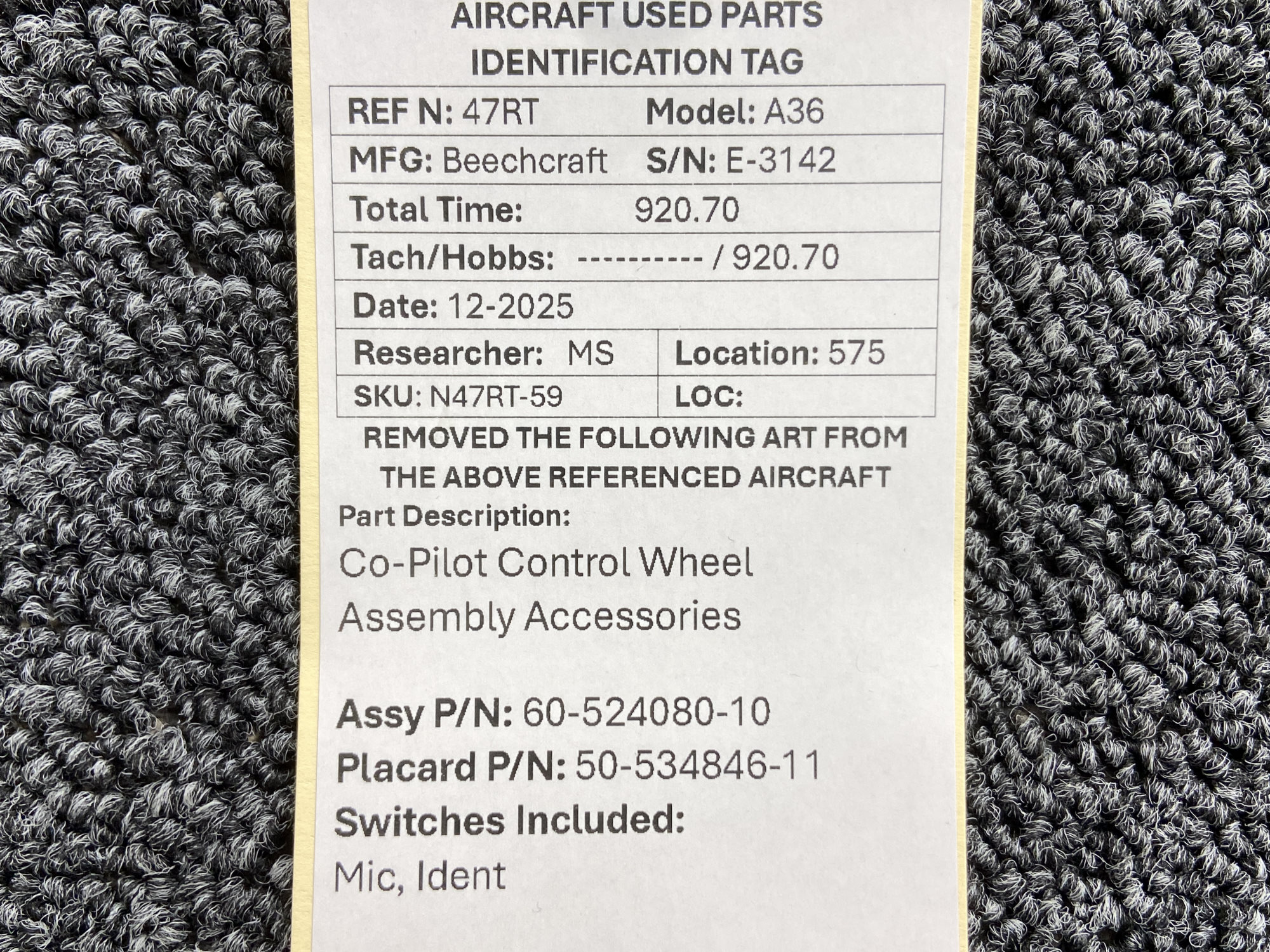 - N47RT-59KW: has placard cover