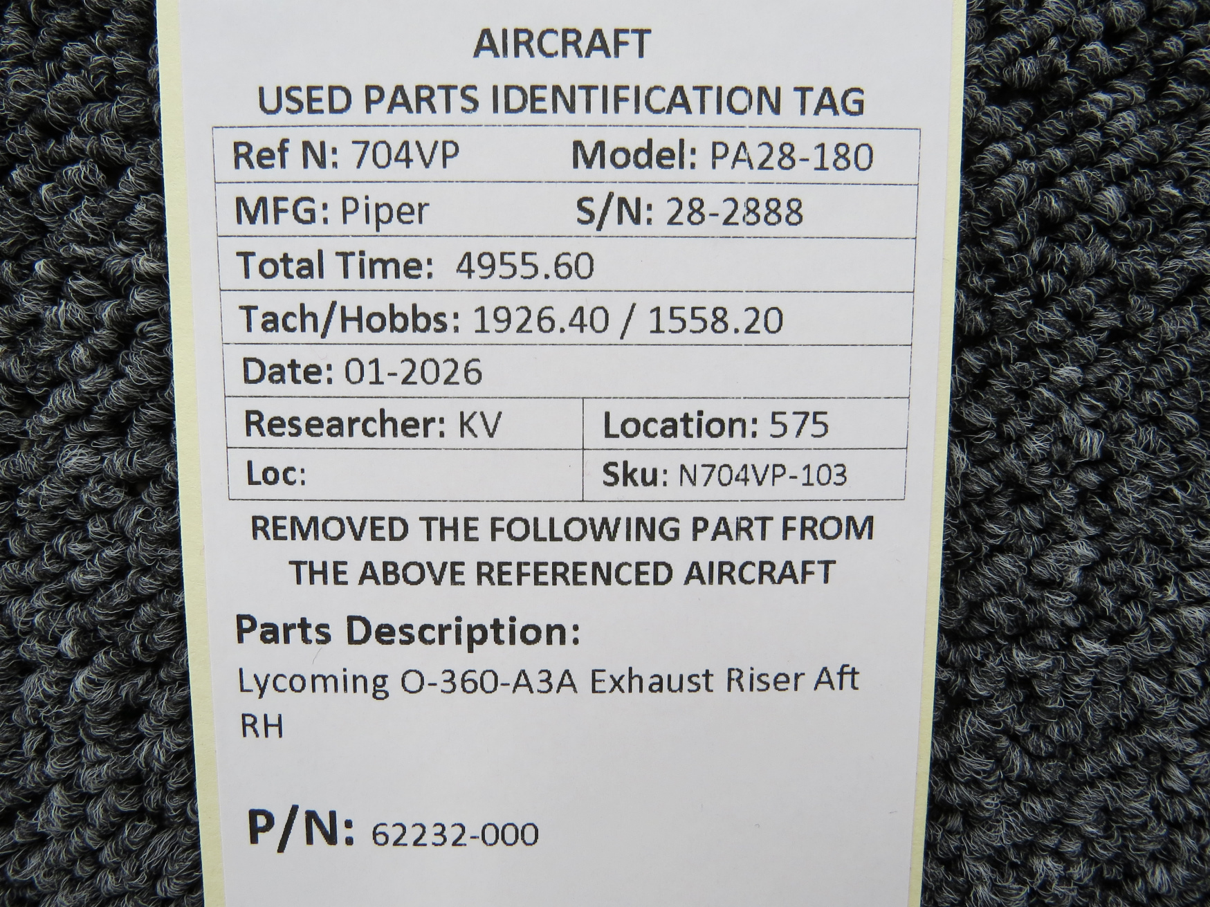 - Removed from Engine: Lycoming O-360-A3A