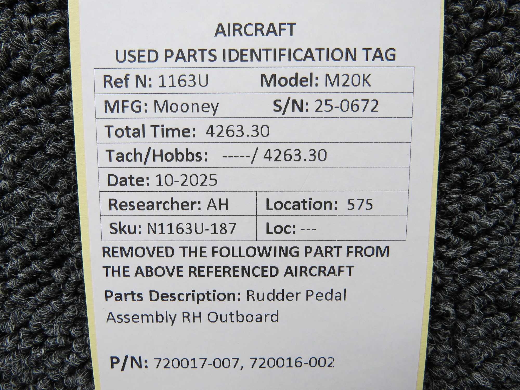 720017-007, 720016-002 Mooney M20K Rudder Pedal Assembly RH Outboard
