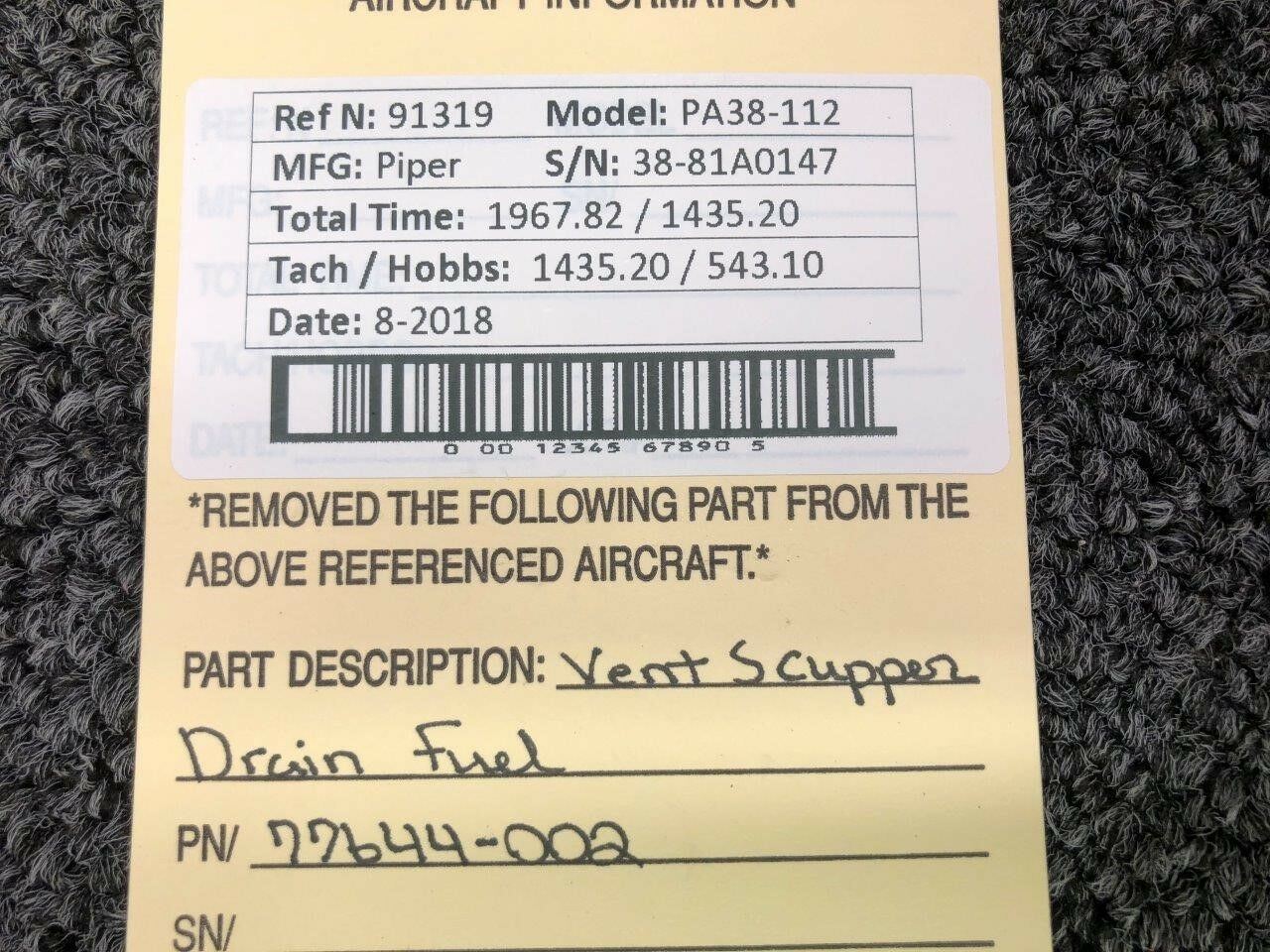 77644-002 Piper PA38-112 Vent Scupper Drain Fuel