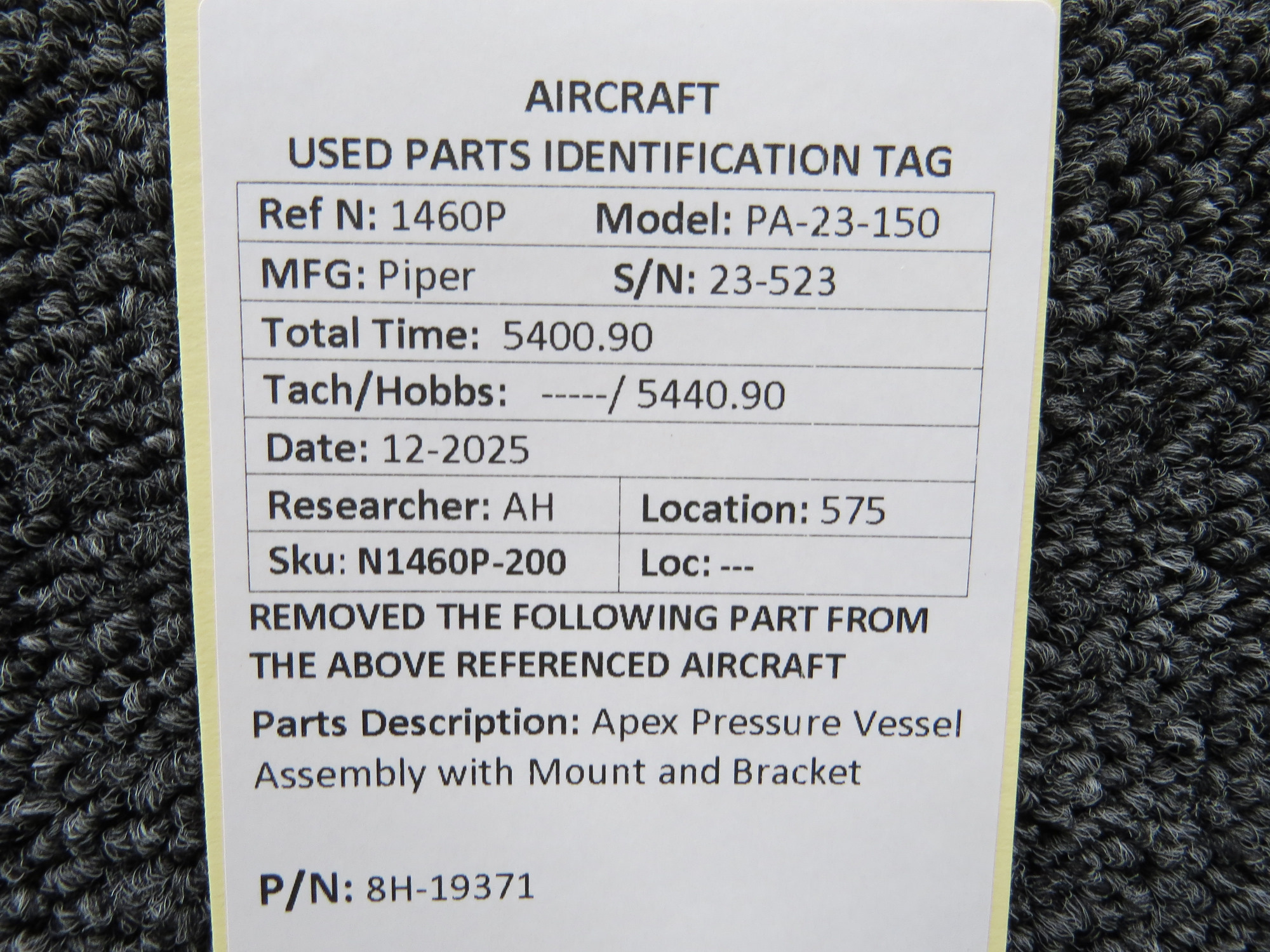 - Apex Pressure Vessel Part Number: 8H-19371