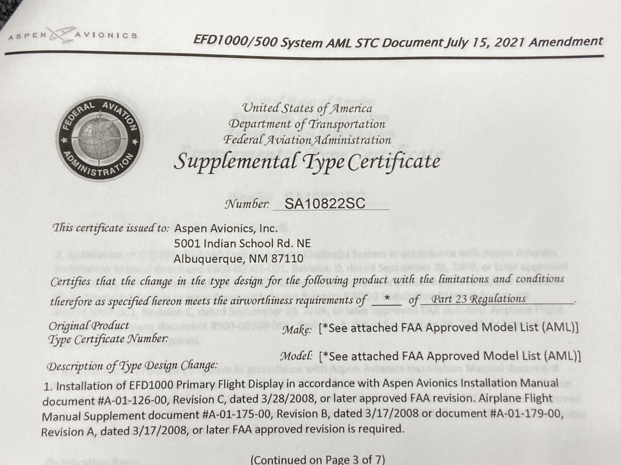 - STC Number: SA10822SC