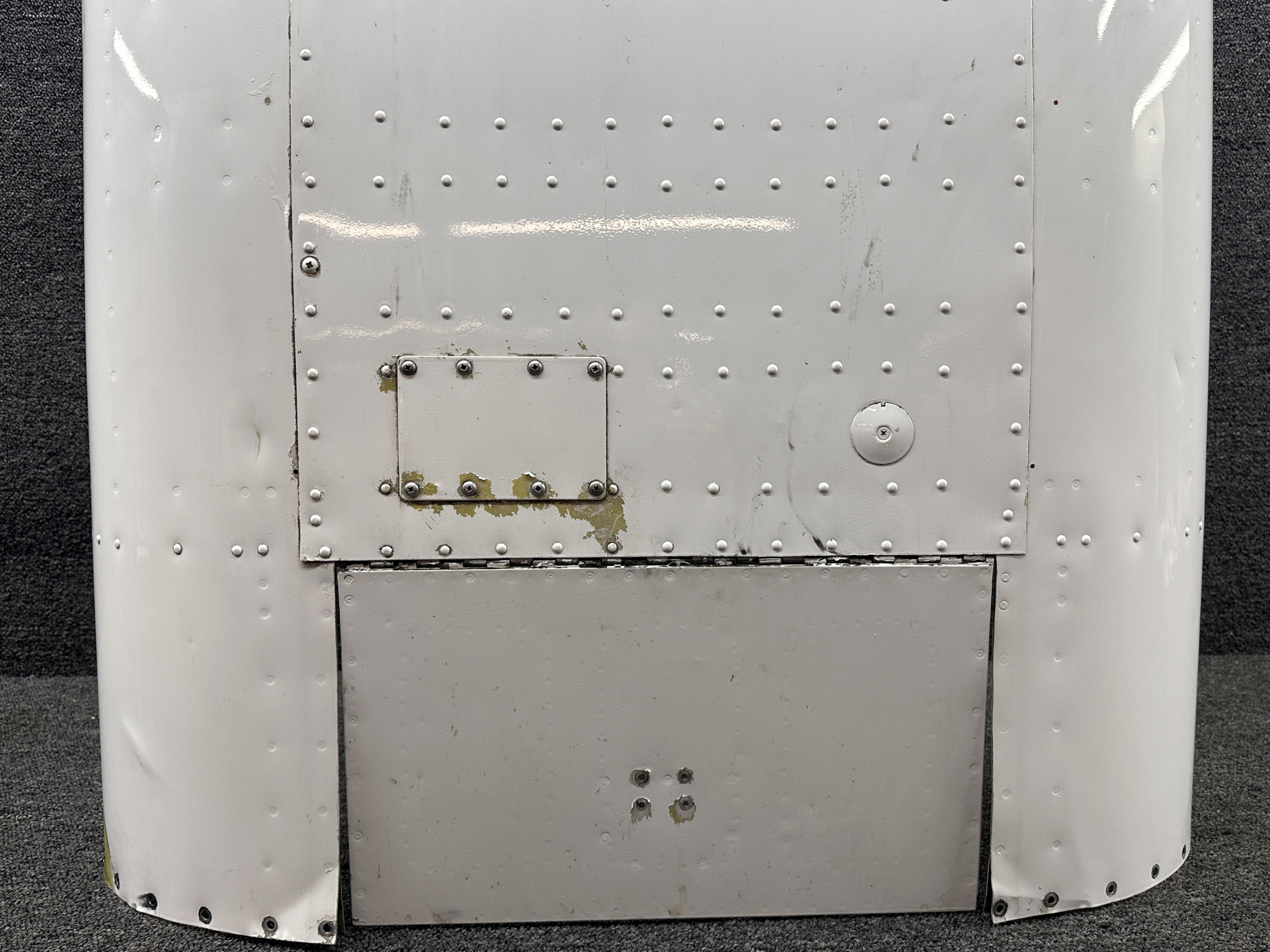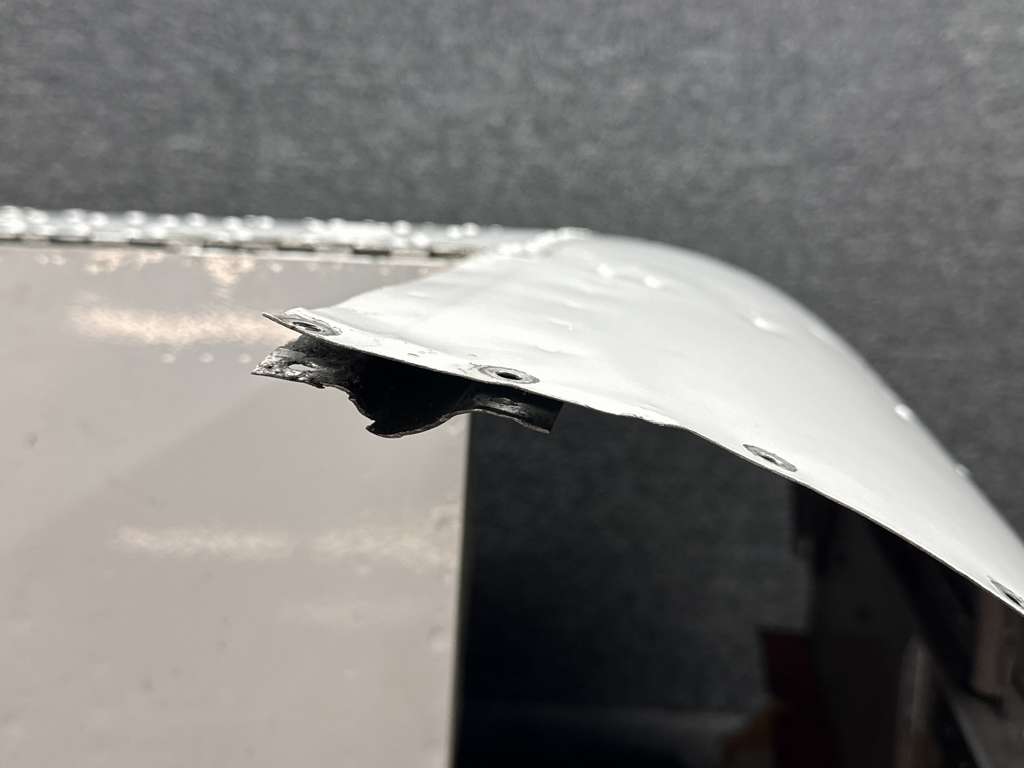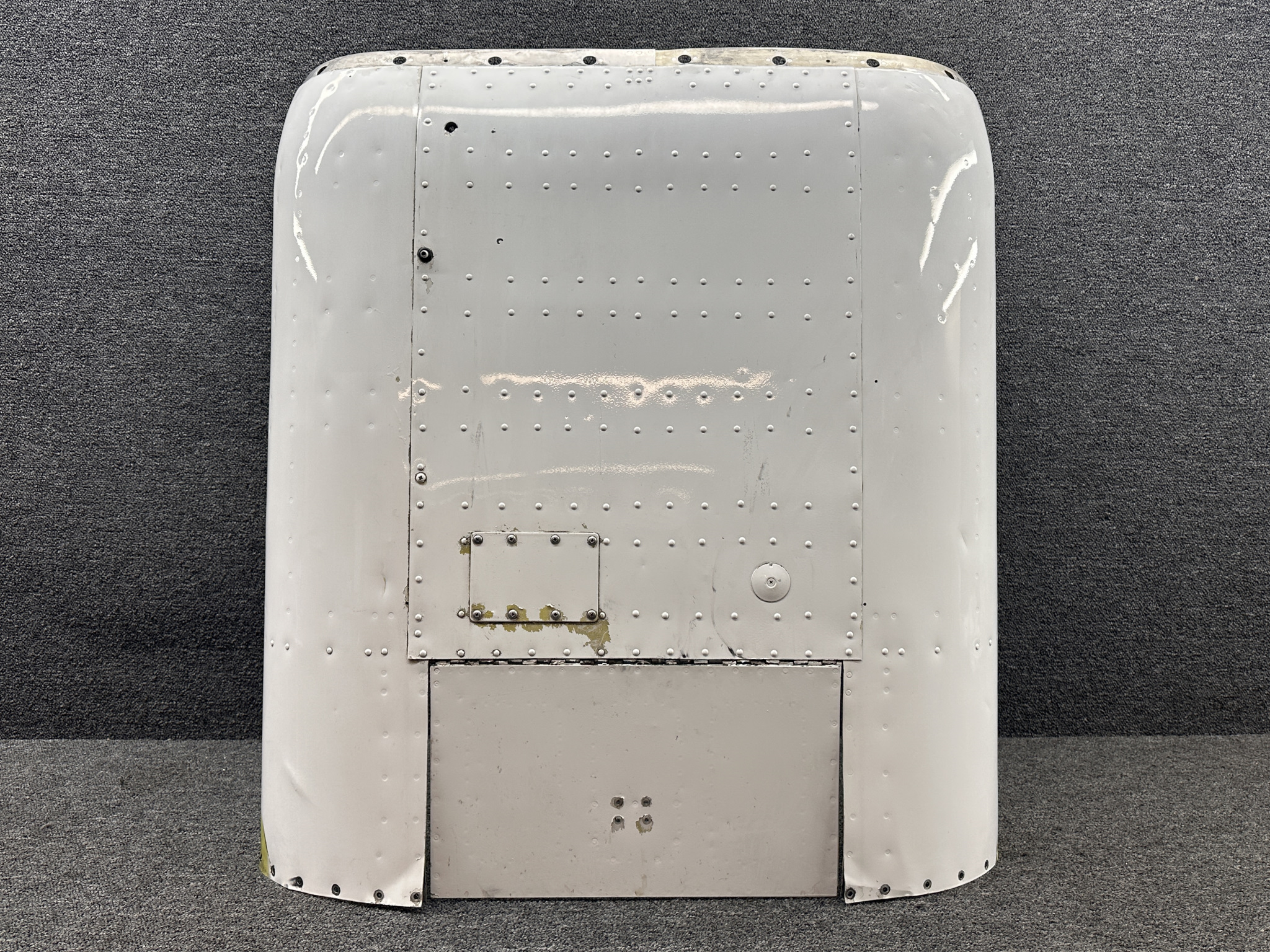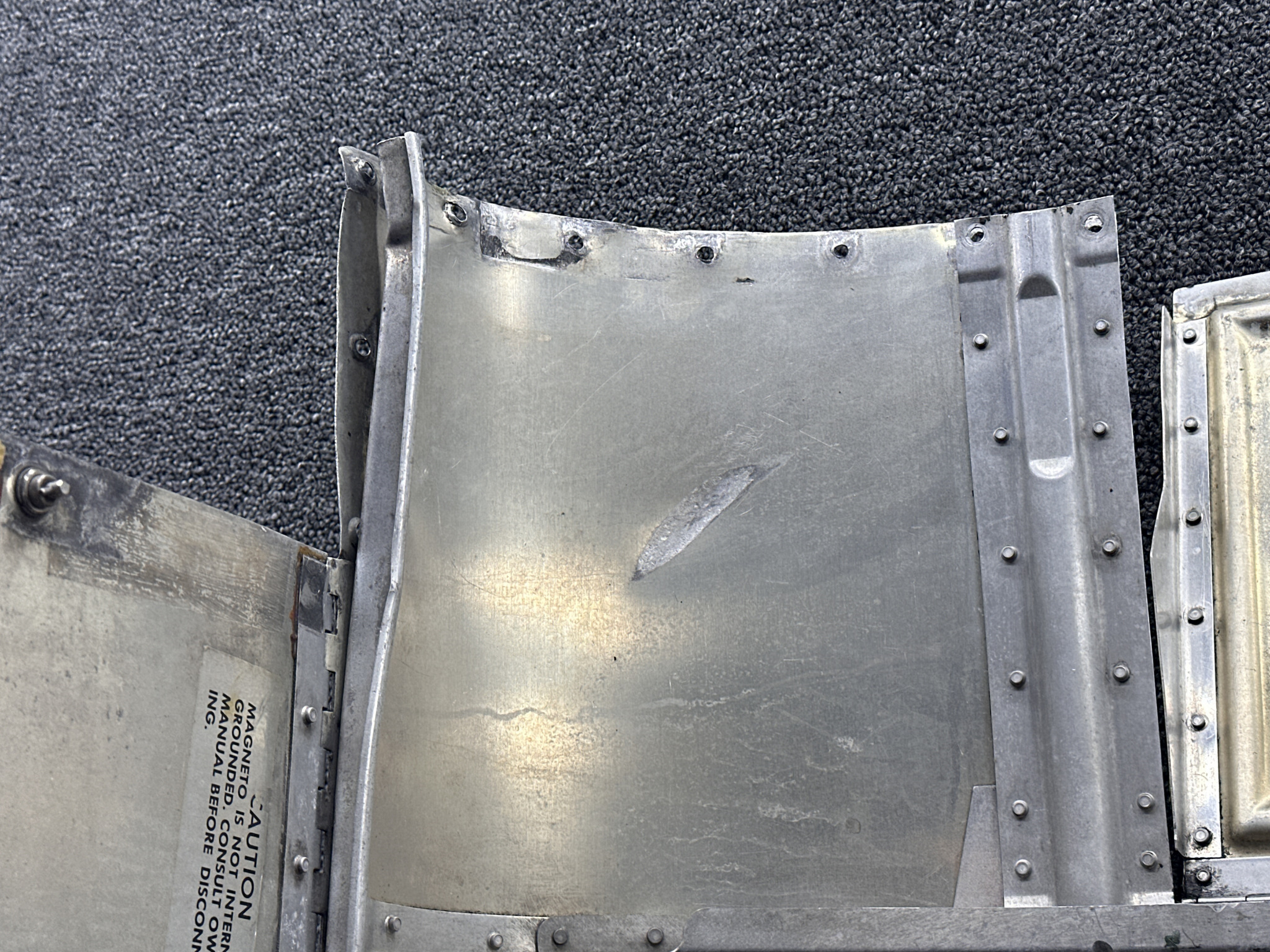 - Damage all around, heavy patching, couple of small dents on surface, and mounting separating from cowling