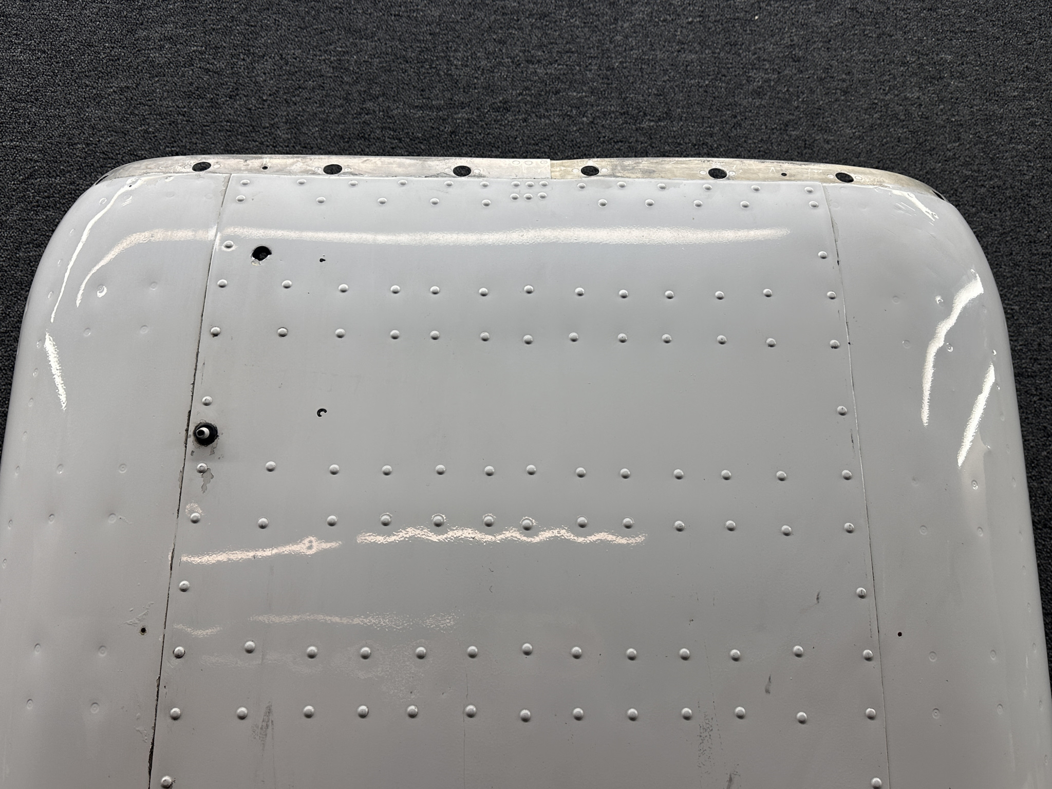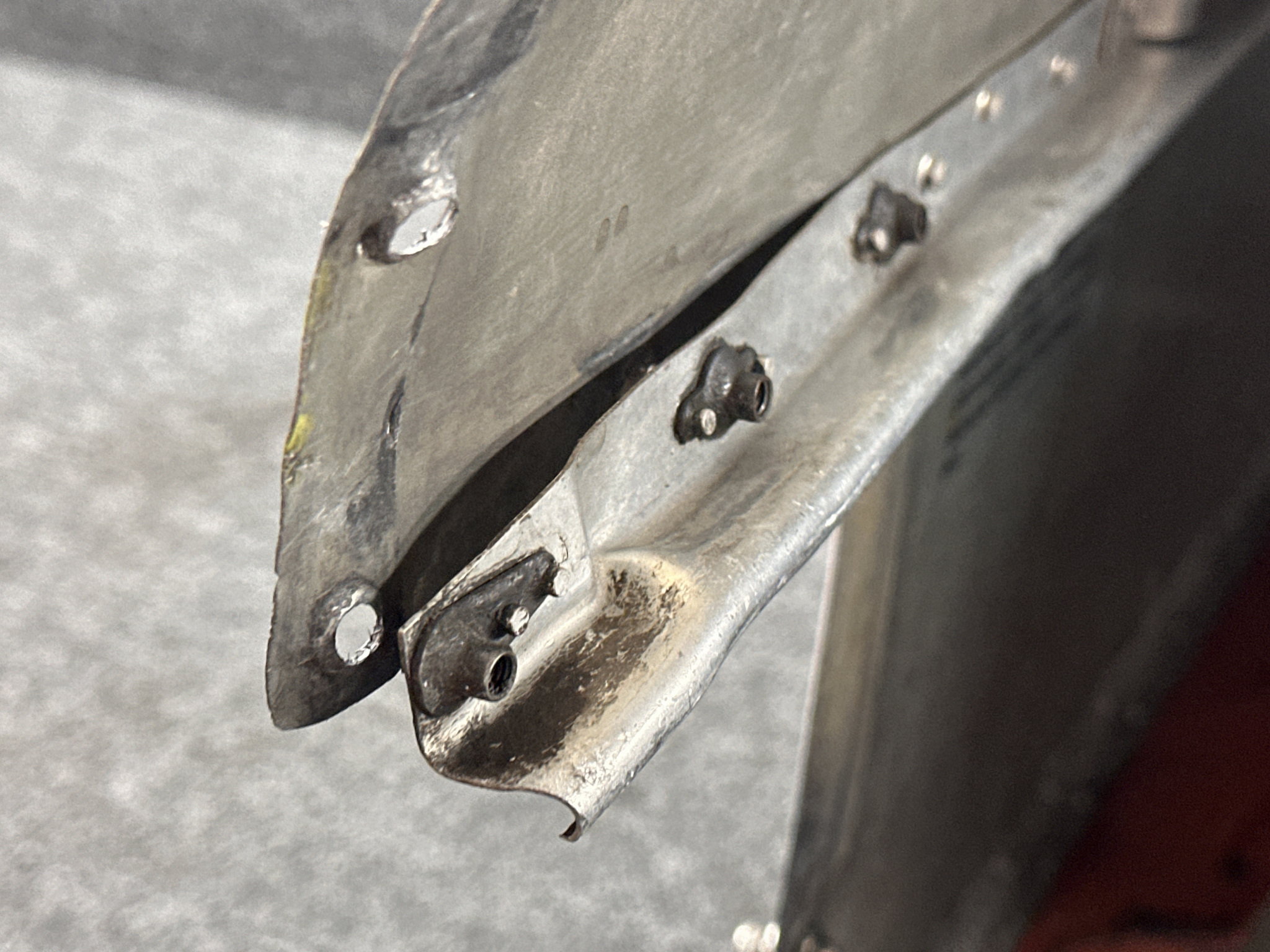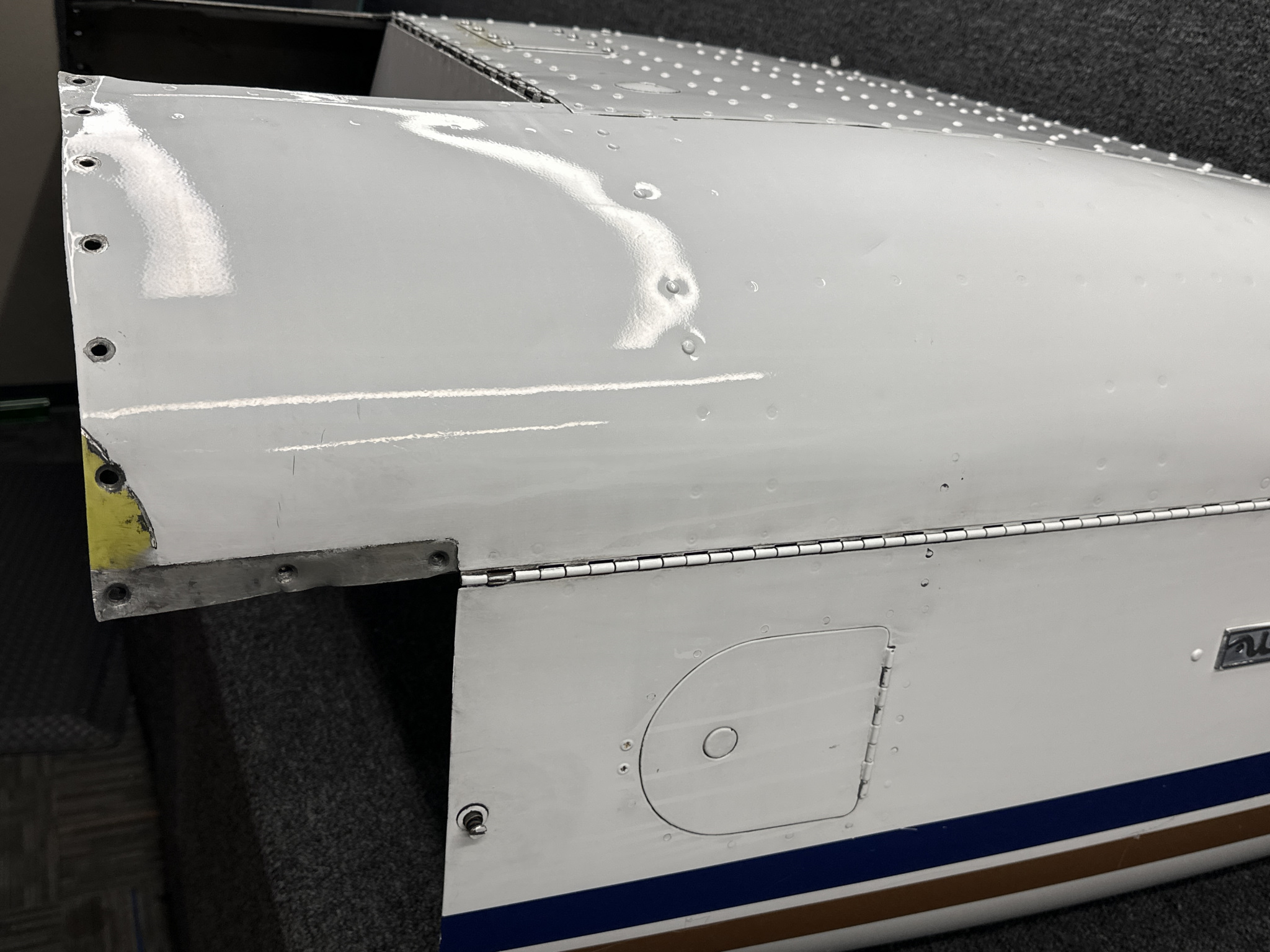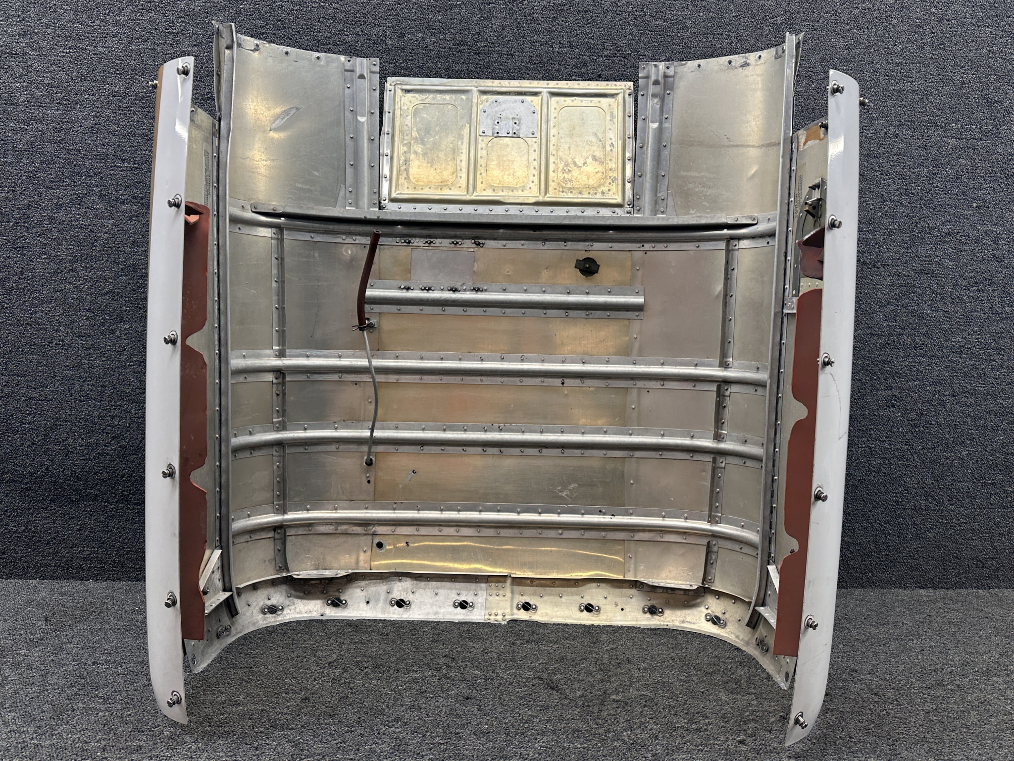 - Damage all around, heavy patching, couple of small dents on surface, and mounting separating from cowling