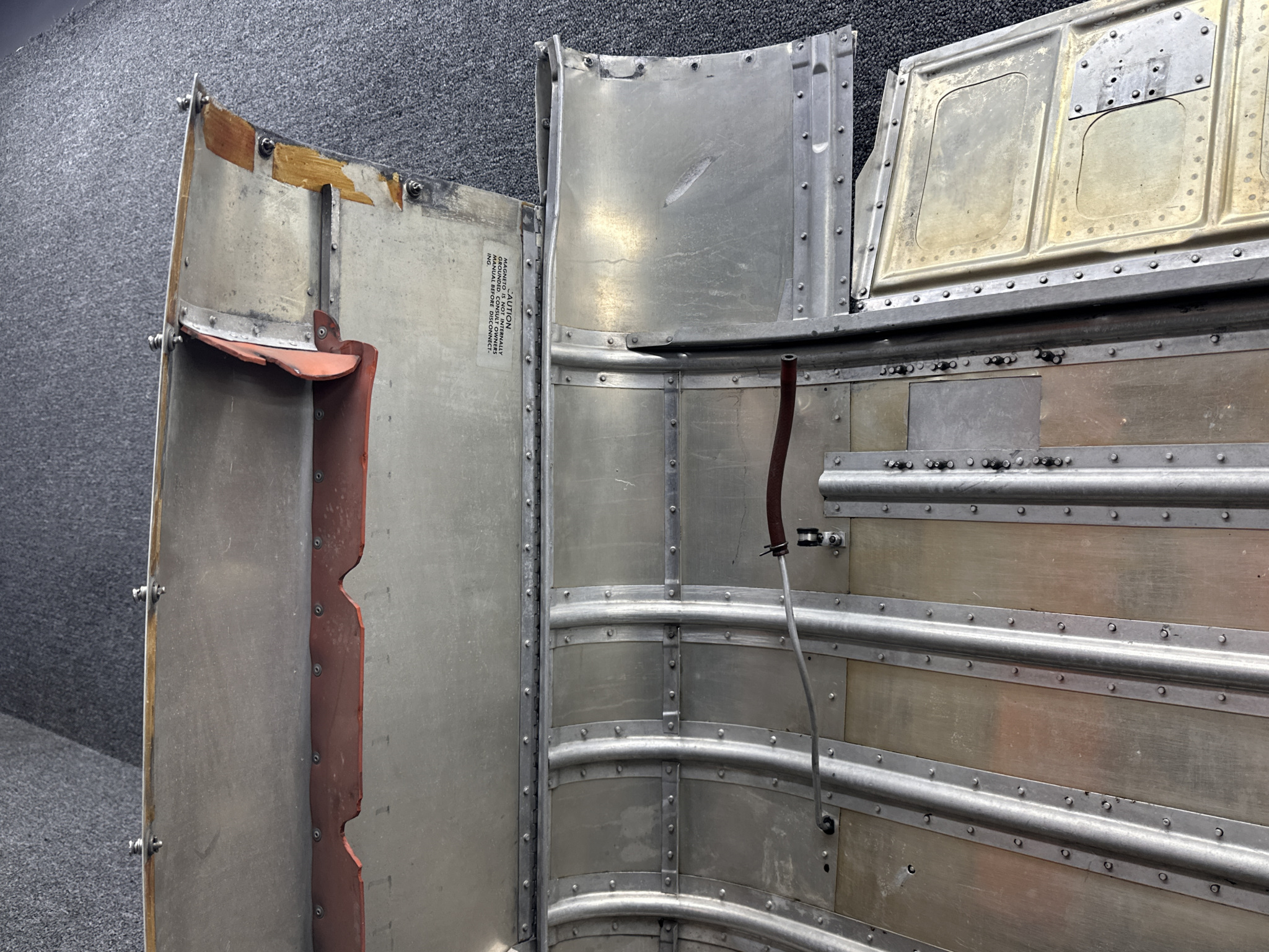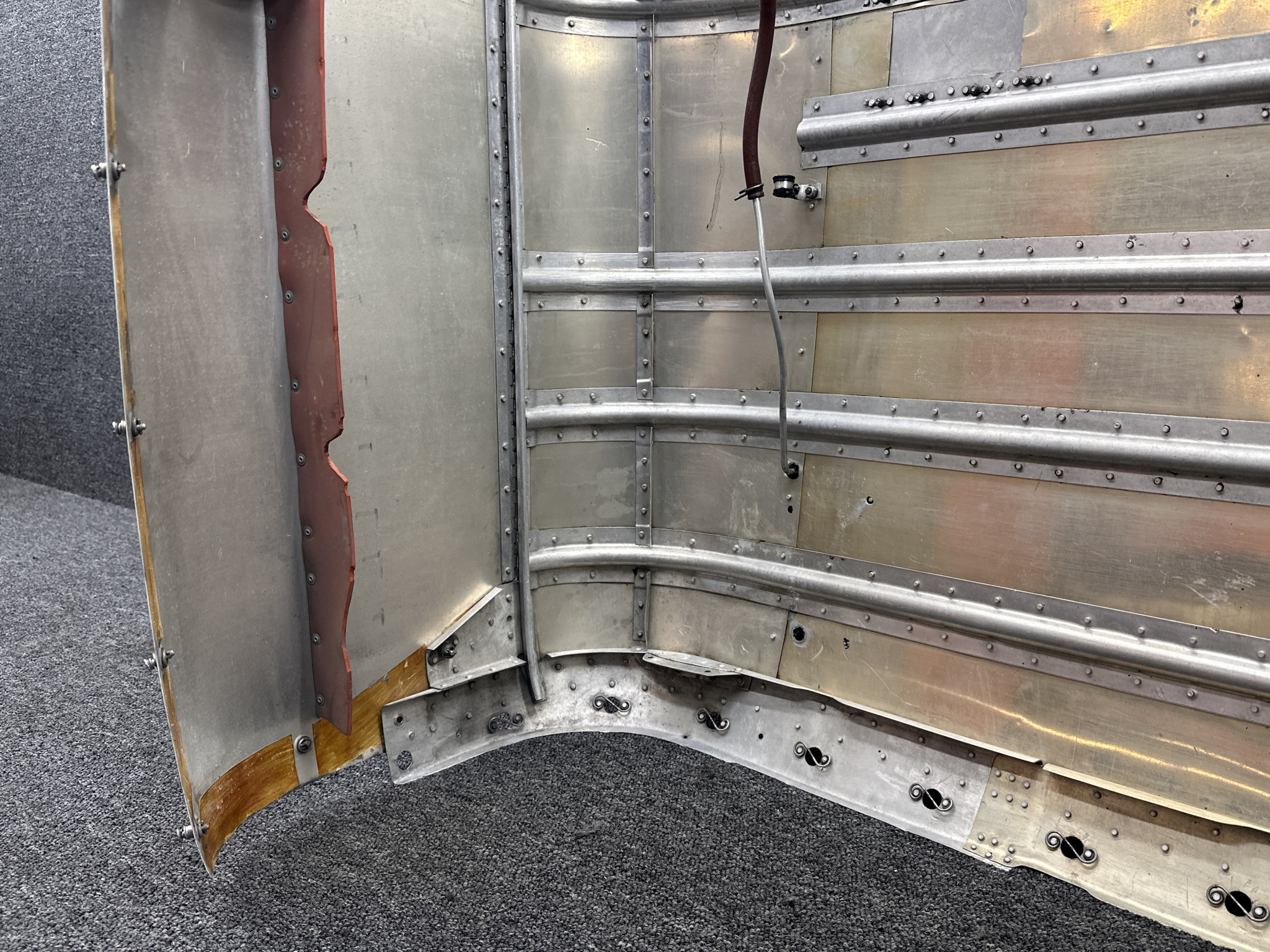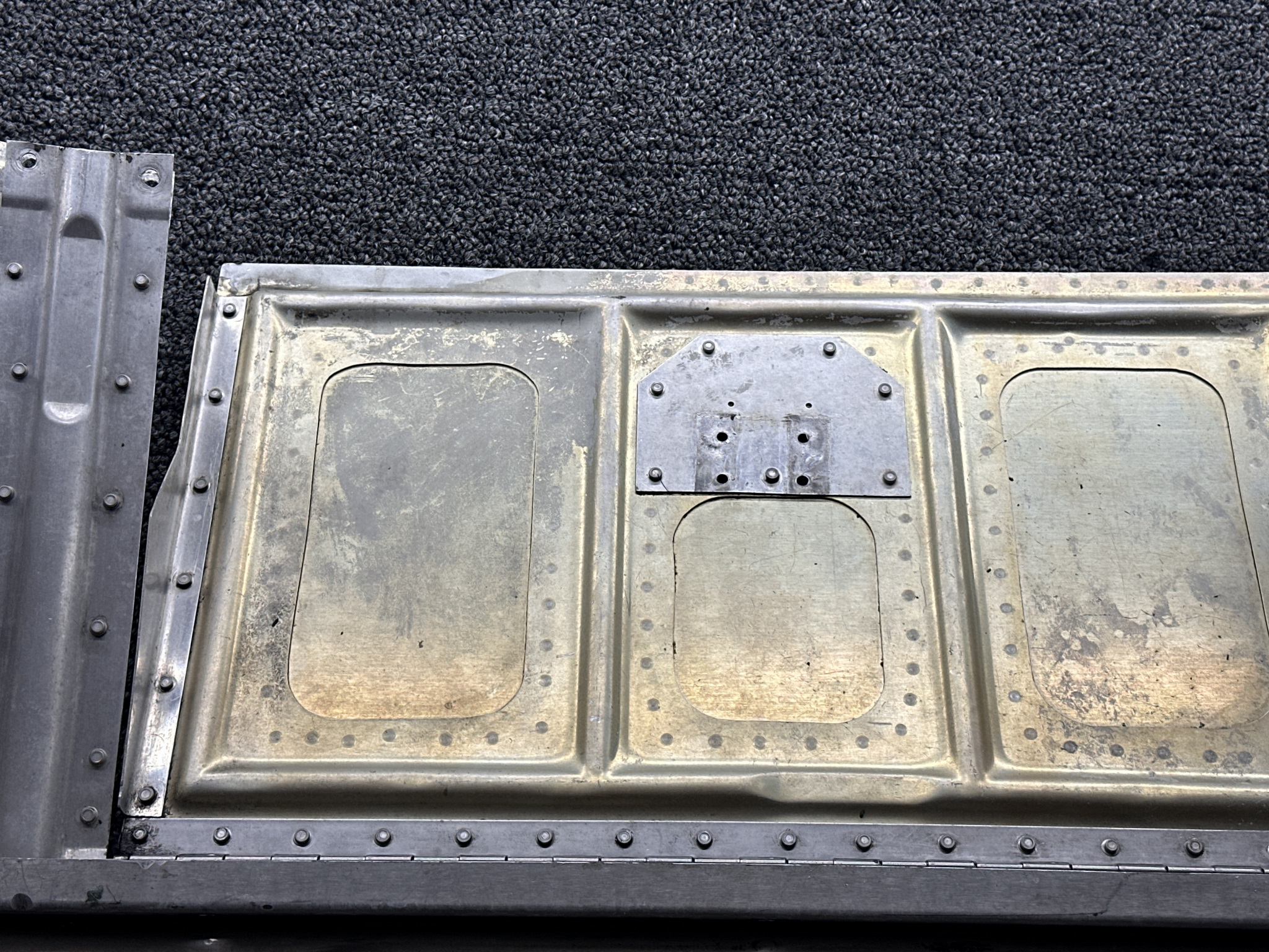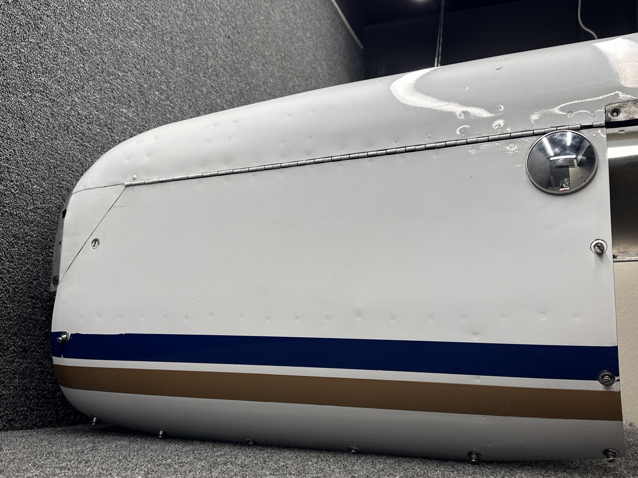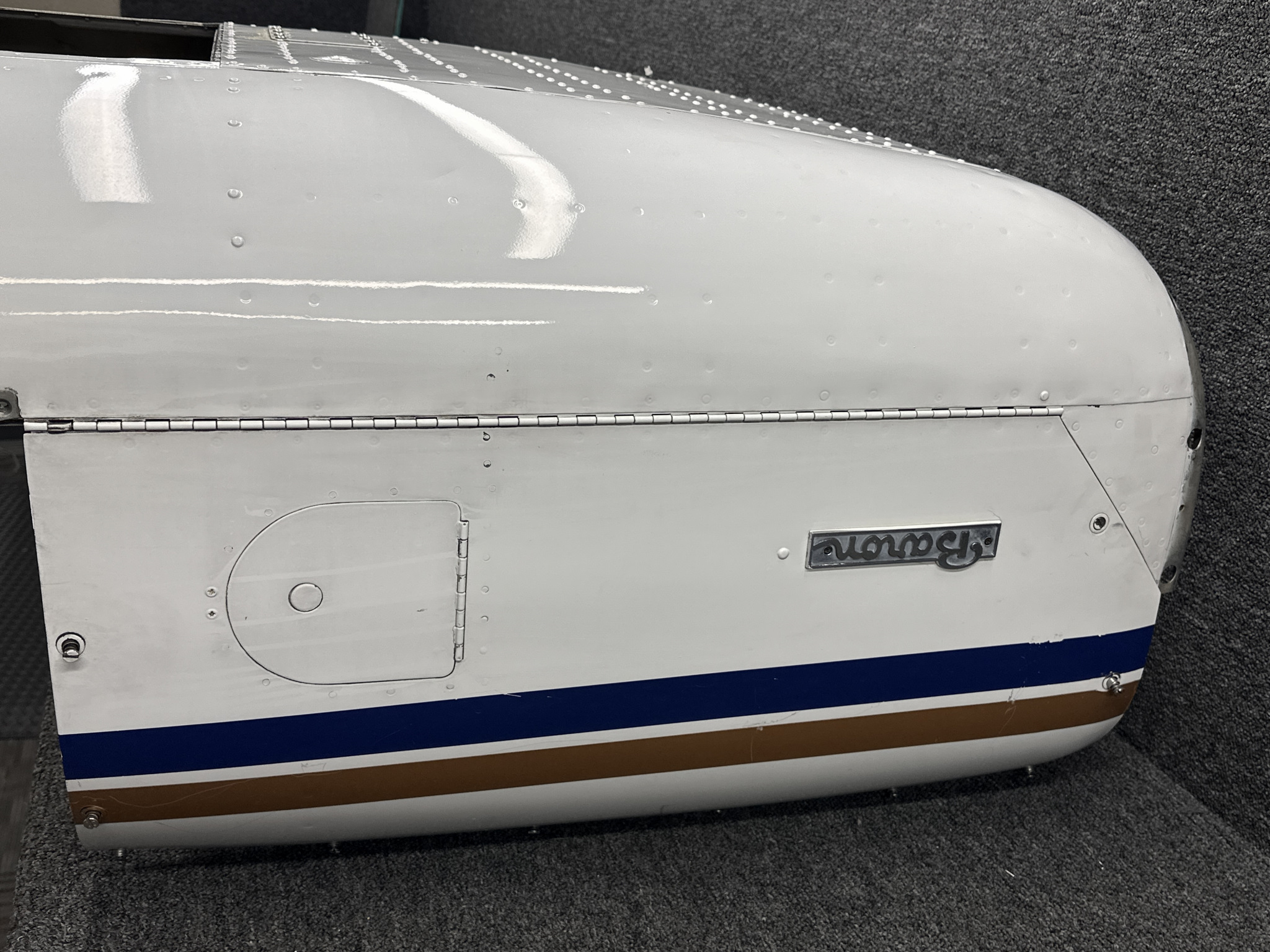- Damage all around, heavy patching, couple of small dents on surface, and mounting separating from cowling