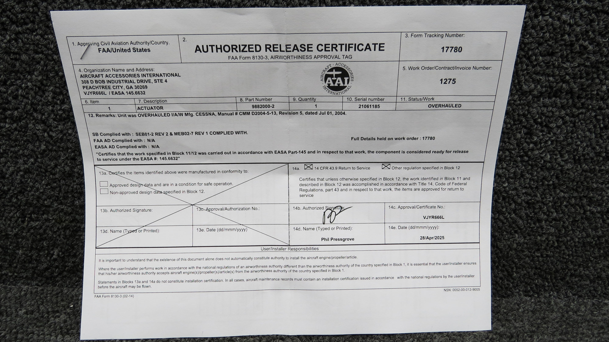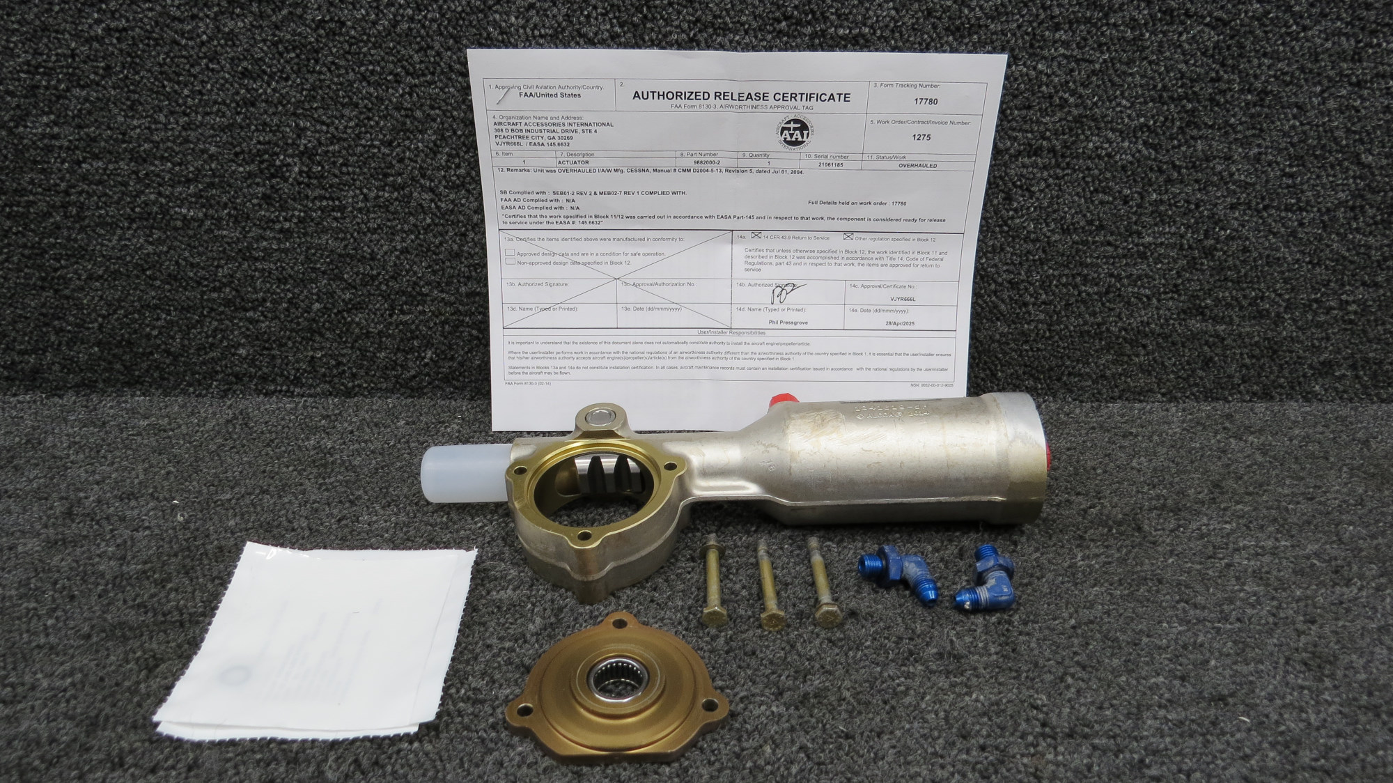 - Comes with 8130-3 paperwork and rebuild kit
