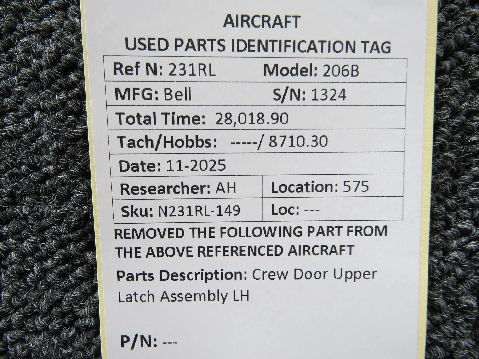 Bell 206B Crew Door Upper Latch Assembly LH