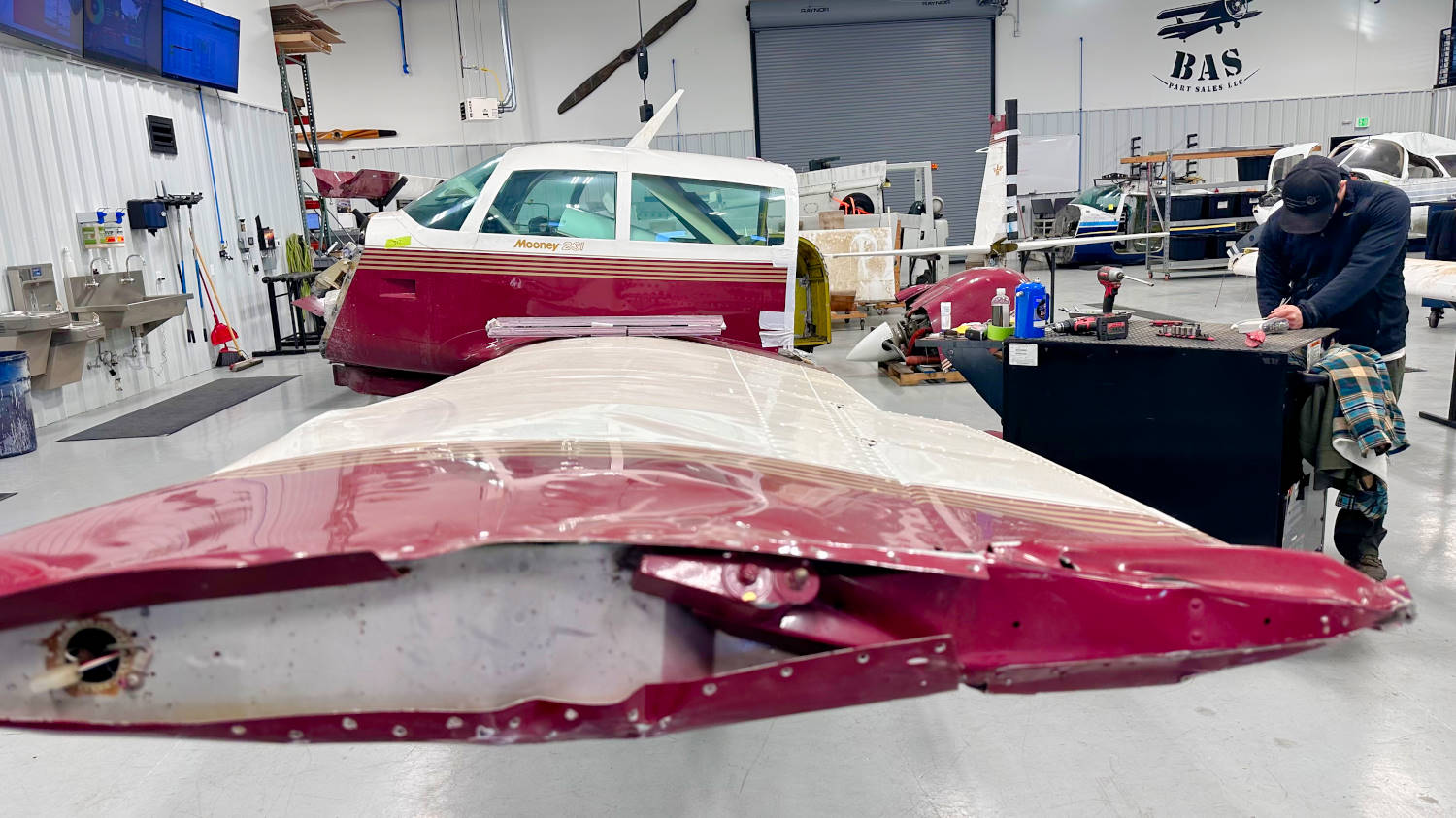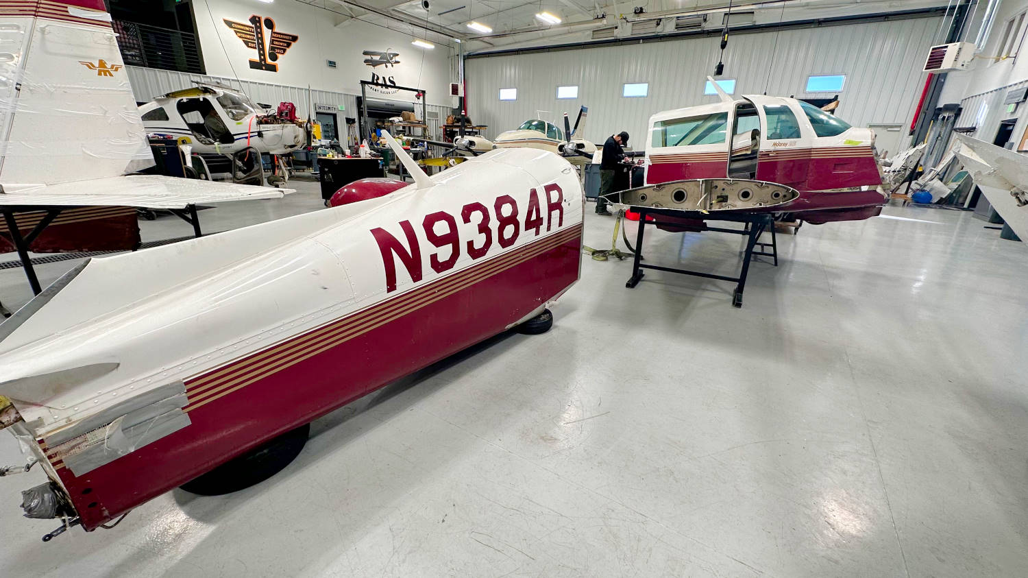 After a couple of weeks of quite a few Cessna 172 tear-downs back to back, we have moved in some fresh new aircraft for disassembly this week. The shop is full of airplanes and wings this week. We have a nice little Cessna 162 Skycatcher that ended up on its roof after landing. A Piper PA-28R-201 that looks like it was hit by a tornado, because it was. And a Mooney 231 (M20K) that was forced to land on a highway, instead of a runway.