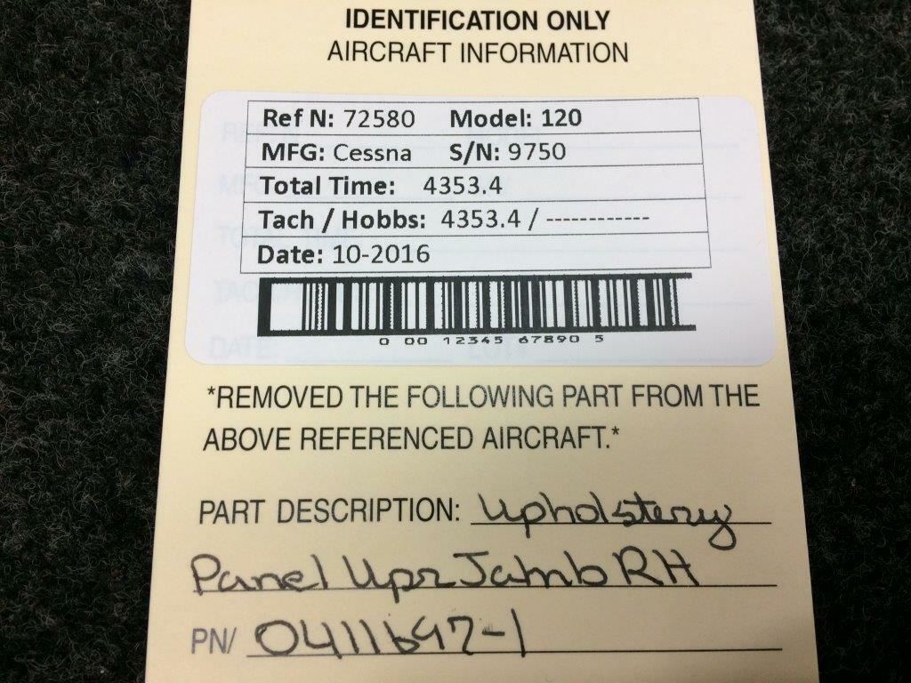 This is a Cessna 120 Upholstery Panel Upper RH Jamb P/N 0411697-1. Guaranteed to work and pass your inspection or your money back with our 90-Day Warranty.