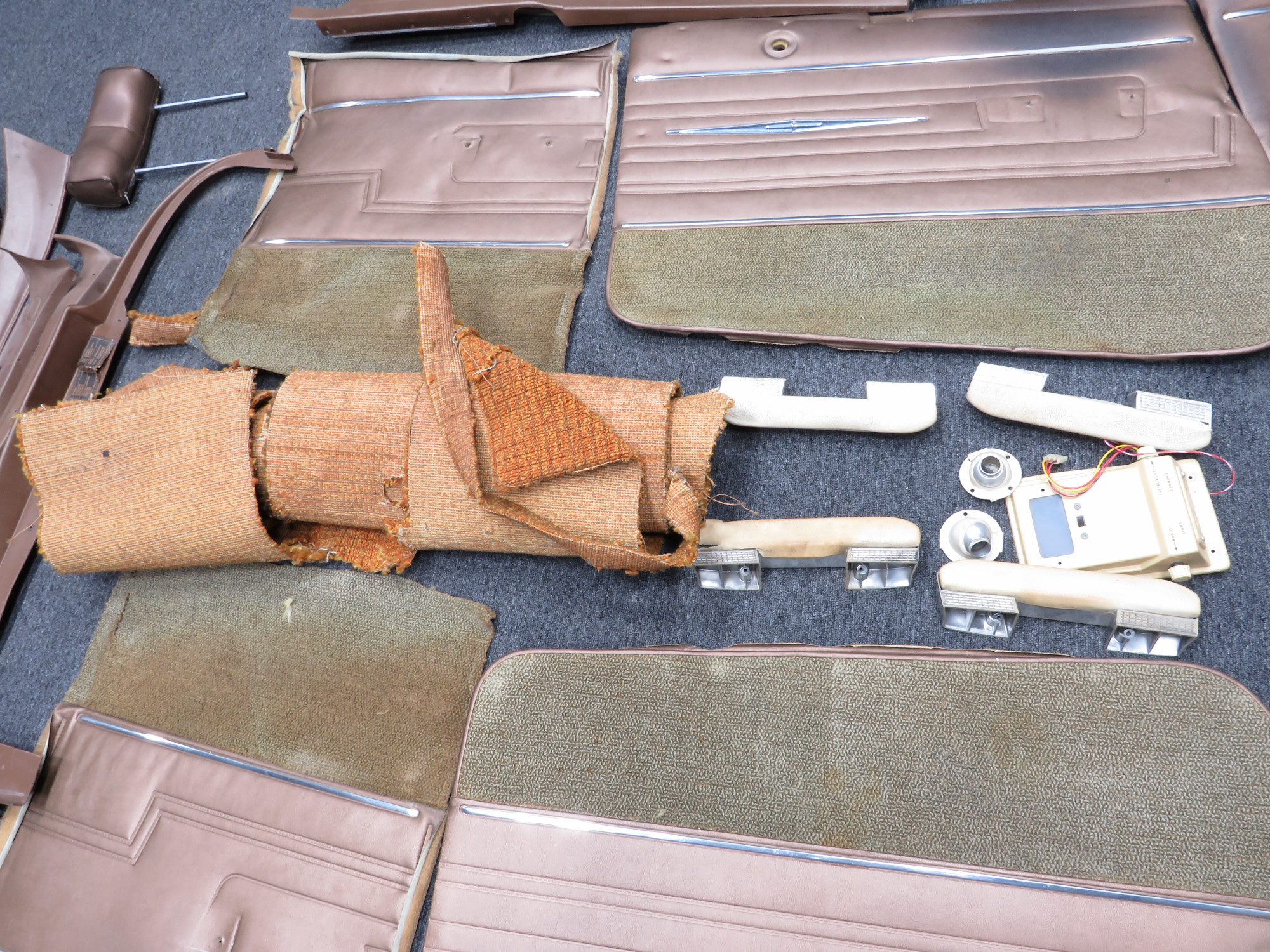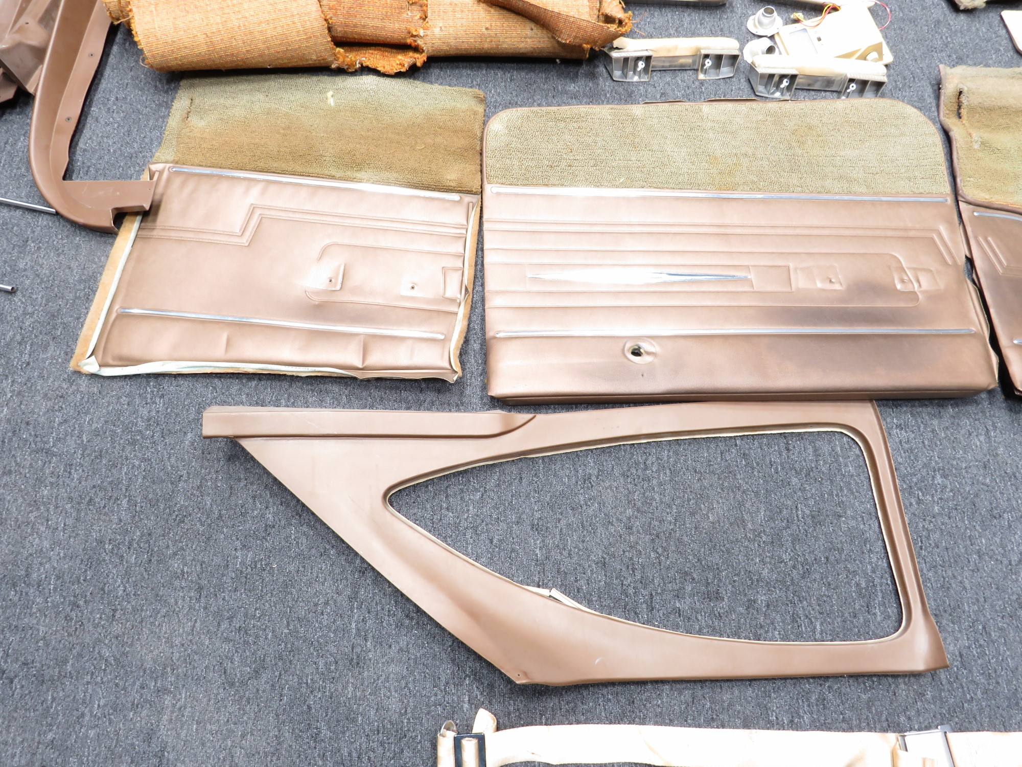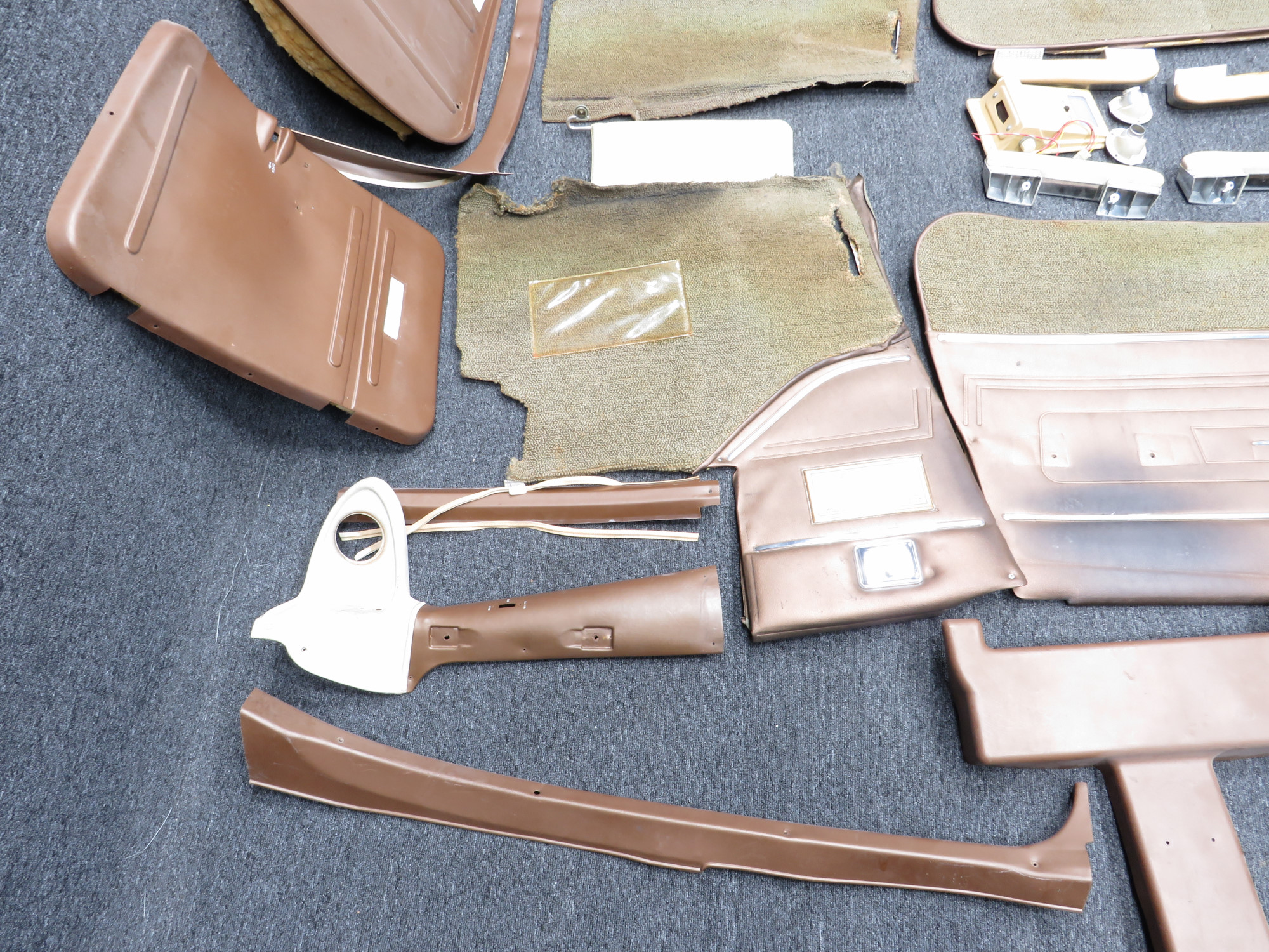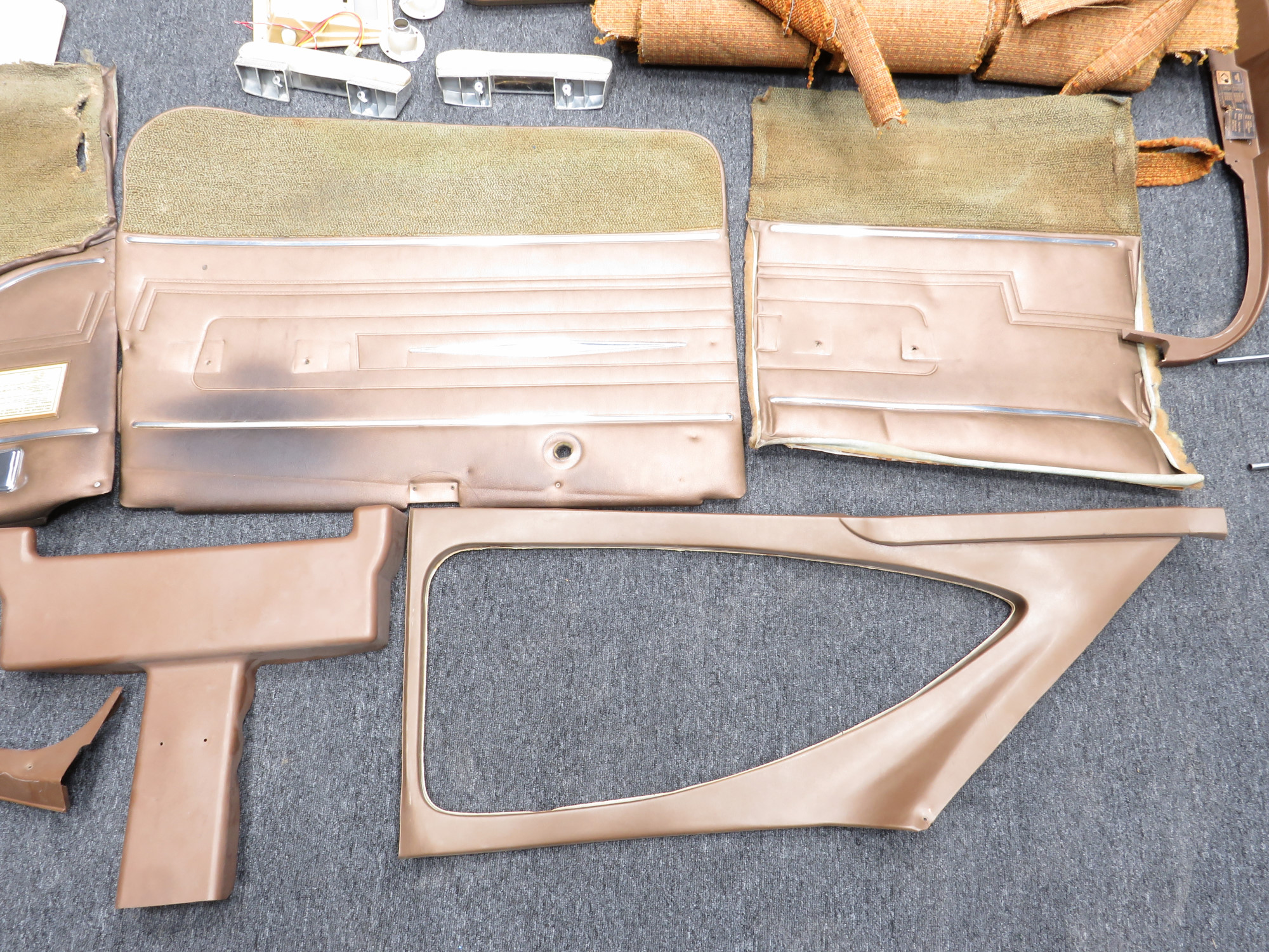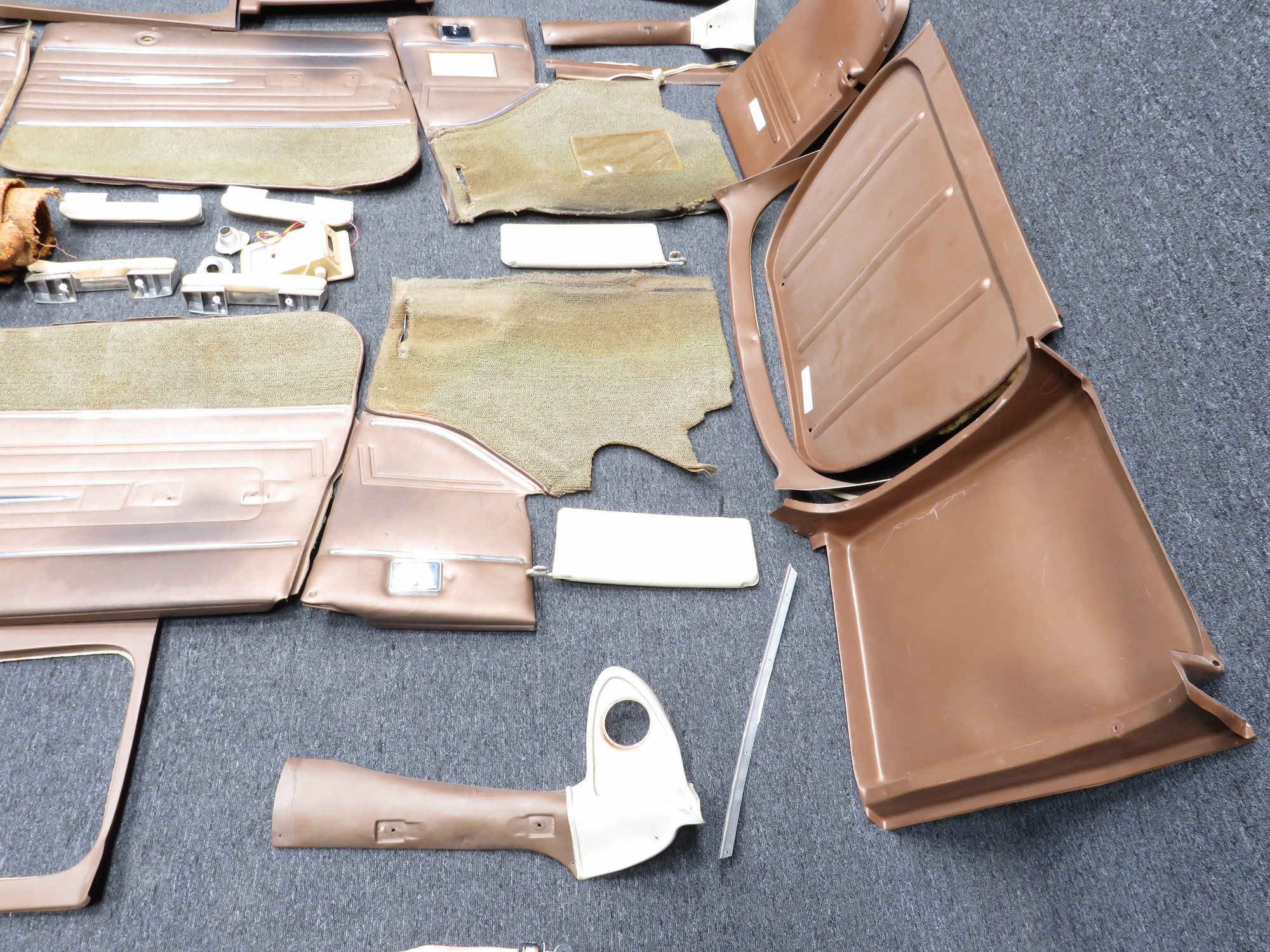 - Bronze brown Pleather side panels with metal accents and light brown stained carpet