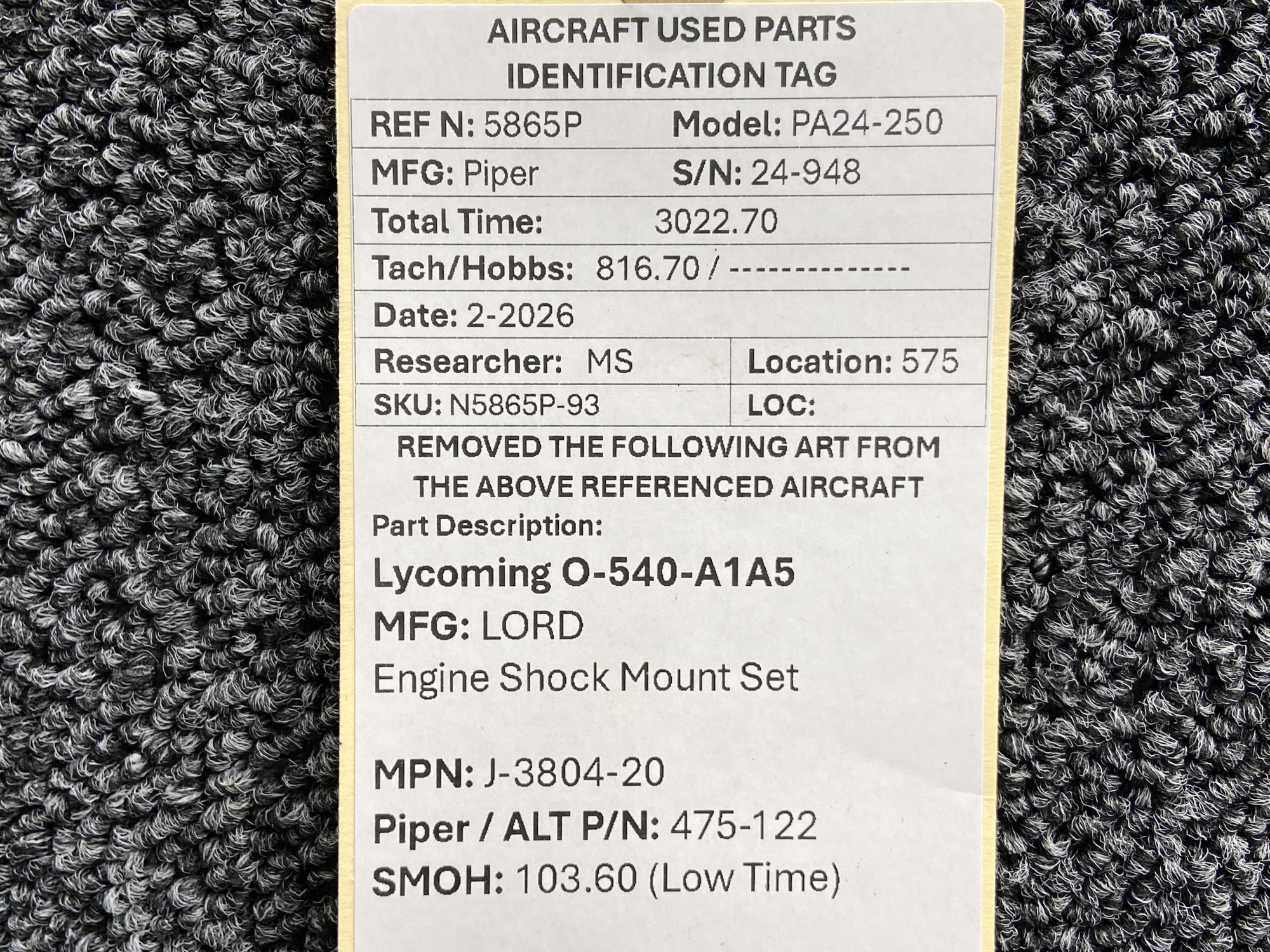 - Removed From: Lycoming O-540-A1A5