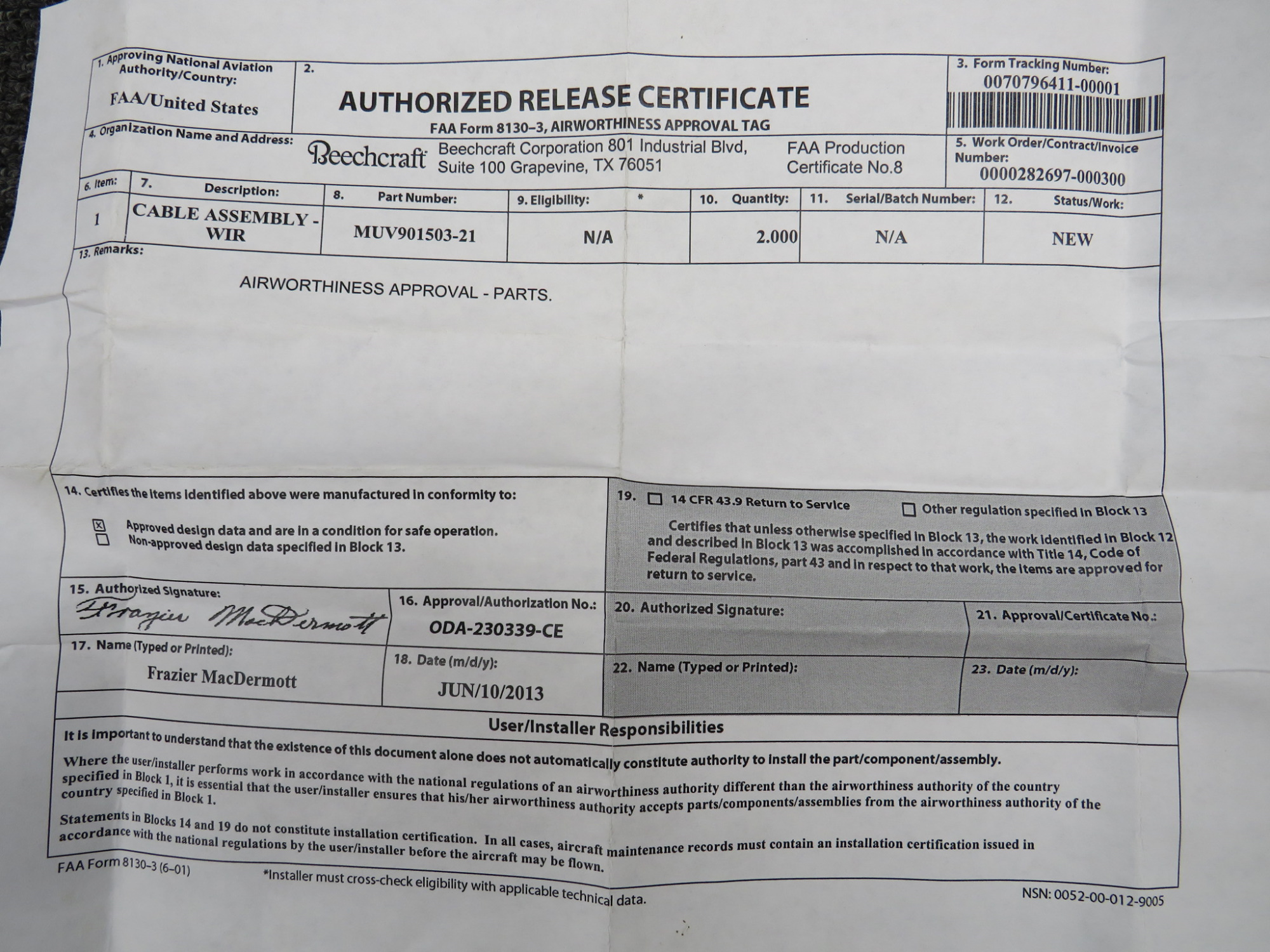 - With 8130 Beechcraft Corporation, done on 06-10-2013