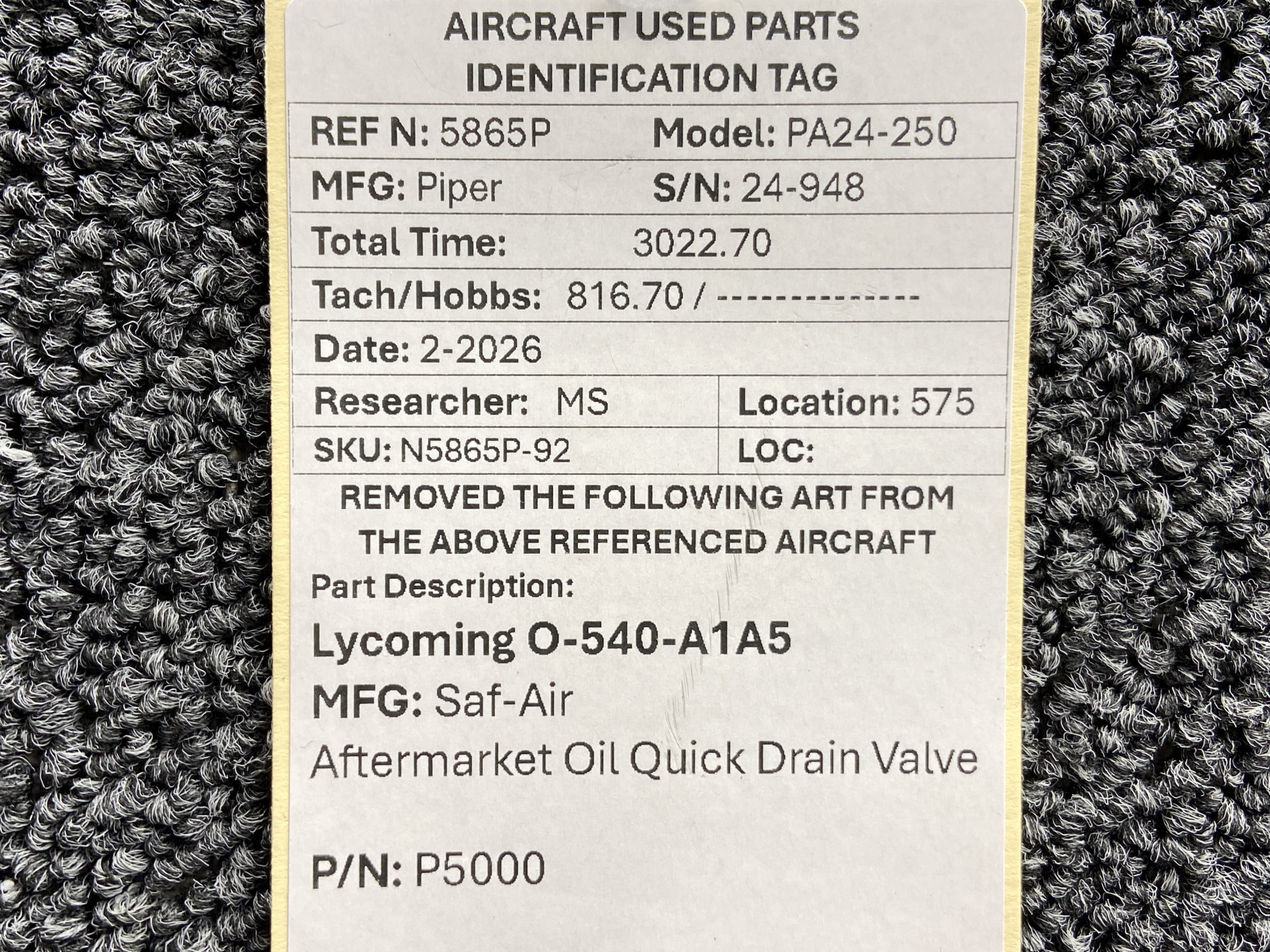 - Removed From: Lycoming O-540-A1A5