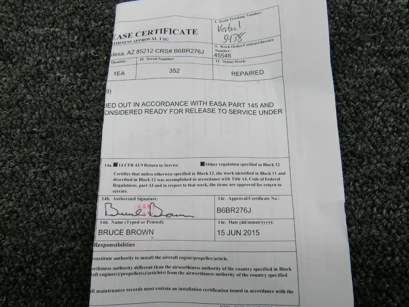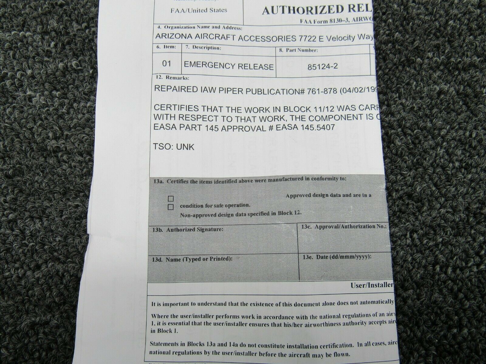 - This part has been repaired and comes with and EASA Part 145 dual release 8130-3 form