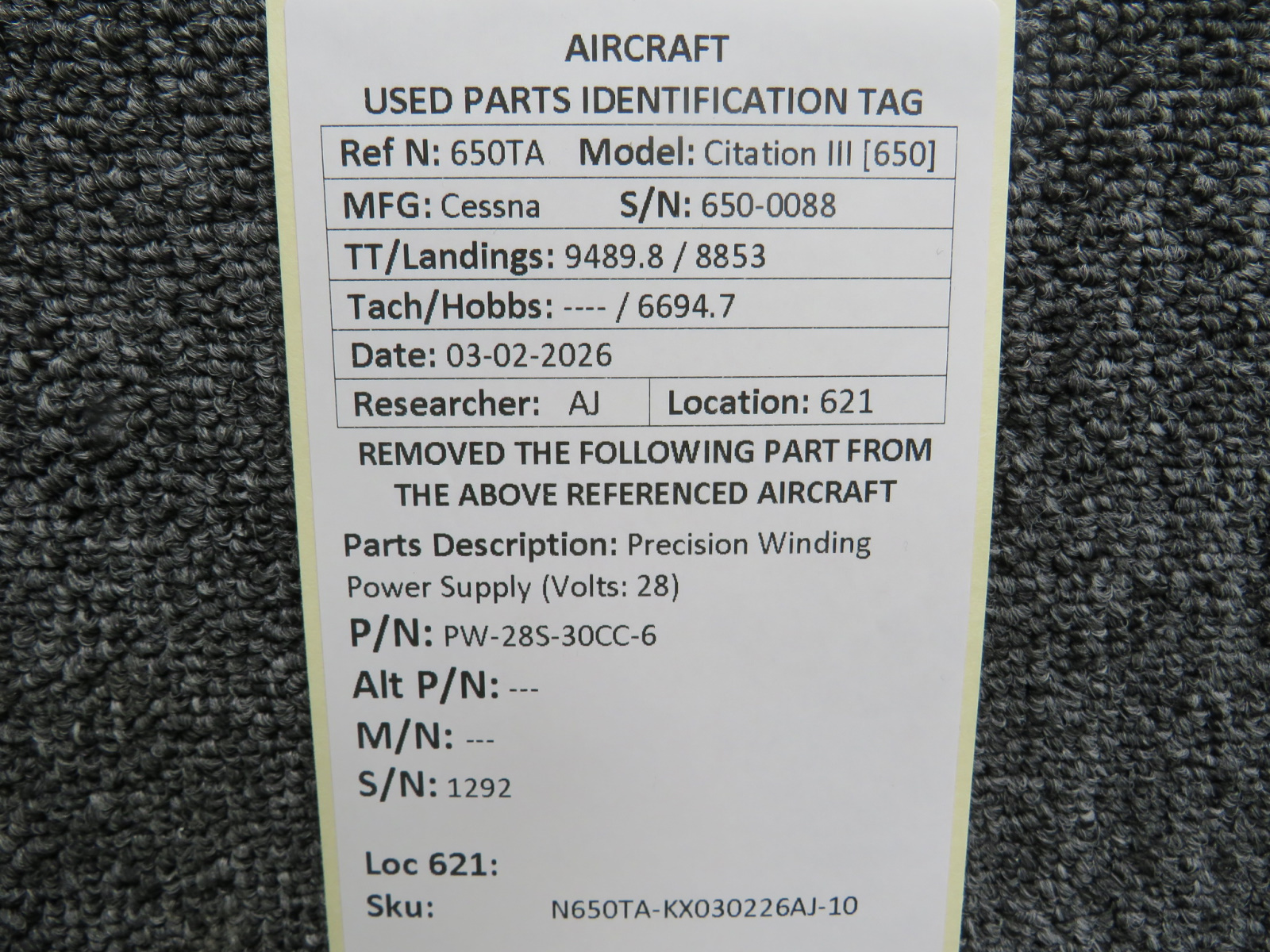 Every part is carefully inspected throughout our process and several times before it goes online. Most items are sold as-removed, just as they came off the aircraft. These parts are not functionally tested. What we do provide is clear photos, full traceability when available, pricing that reflects the as-removed condition, and a no-nonsense 90-day return window.
