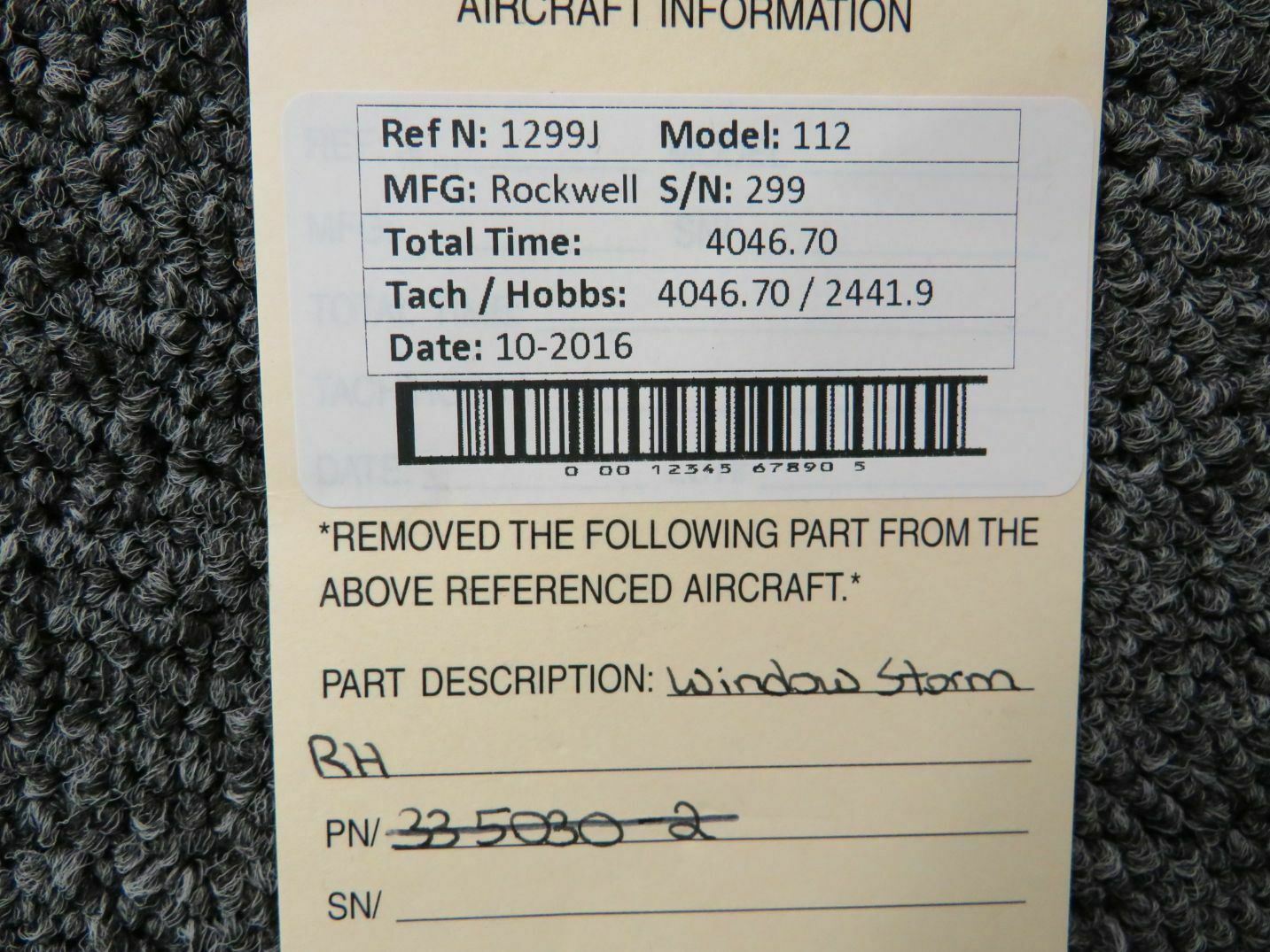 This is a Rockwell 112 Window Storm Assy RH. Guaranteed to work and pass your inspection or your money back with our 90-Day Warranty.