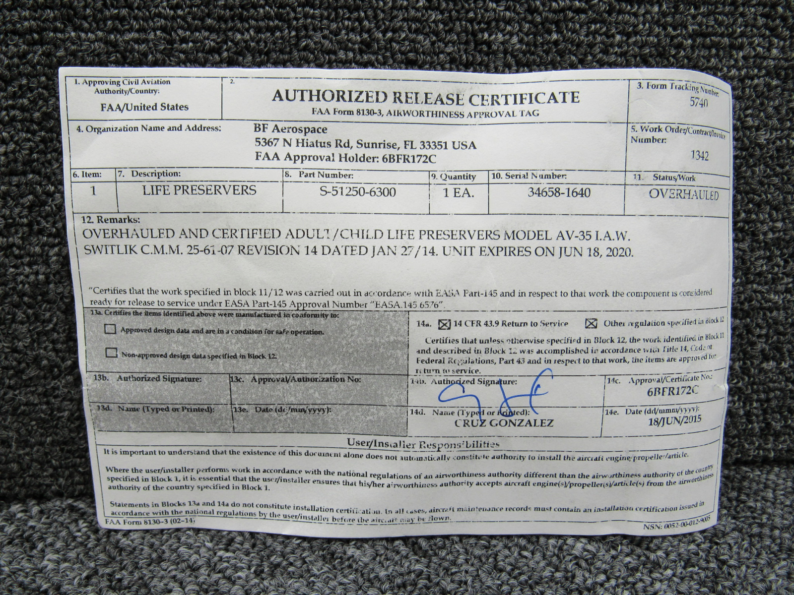 - Inspected by BF Aerospace on 06/18/2015